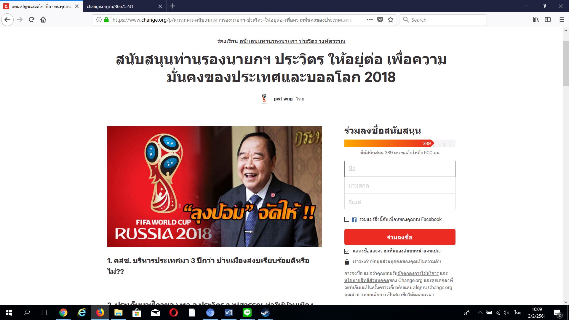 ข้อมูล ณ ช่วงวันที่ 2 ก.พ. เวลา 10.09 น. มีผู้มาลงชื่อร่วมสนับสนุนให้ พล.อ.ประวิตรดำรงตำแหน่งต่อไป จำนวน 389 คน