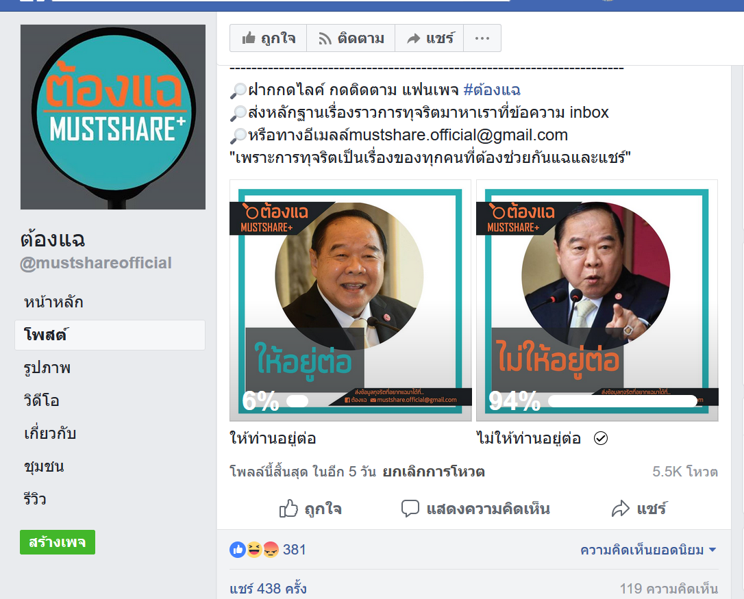เพจต้องแฉ' ชวนคนออนไลน์โหวตตัดสินอนาคต'บิ๊กป้อม' คืนเดียวยอดพุ่ง94%ไม่ให้อยู่ต่อ