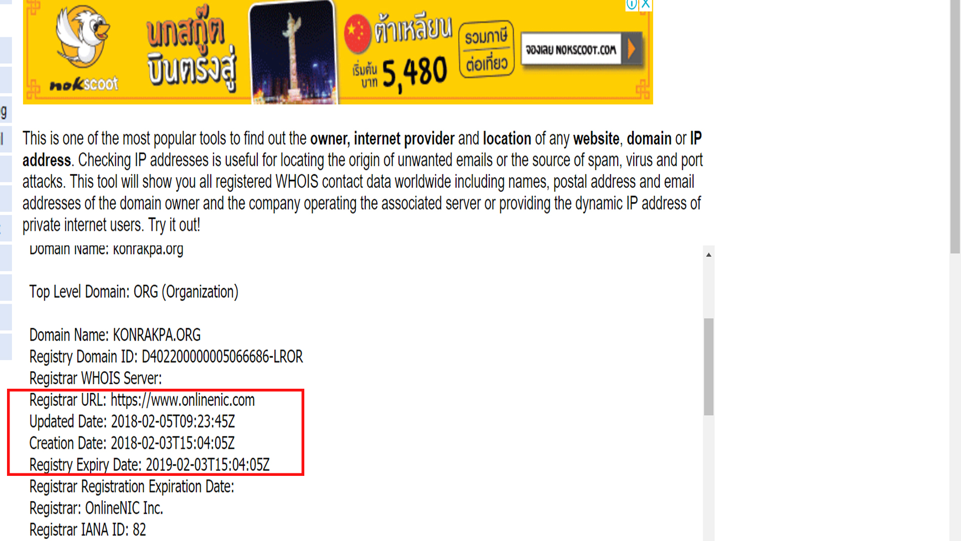 "...เมื่อติดตามตรวจสอบข้อมูลการจดทะเบียนโดเมนของเว็บไซต์นี้ พบข้อมูลที่น่าสนใจเพิ่มเติมคือ เว็บไซต์แห่งนี้มีการก่อตั้งขึ้นเมื่อวันที่ 3 ก.พ.ที่ผ่านมา โดยใช้เว็บไซต์ www.onlinenic.com ซึ่งเป็นเว็บไซต์เช่าพื้นที่ในอินเตอร์เน็ต (Hosting) ที่มีสำนักงานใหญ่อยู่ที่ฮ่องกง ในการจดทะเบียนเว็บไซต์..โดยมีการเข้าไปอัพเดทข้อมูลบนหน้าเว็บไซต์เพียงครั้งเดียวในวันที่ 5 ก.พ.ที่ผ่านมา และเว็บไซต์นี้จะหมดอายุหลังจากครบรอบ 1 ปีแล้ว ซึ่งก็คือในวันที่ 3 ก.พ. 2562 ยกเว้นแต่ว่าผู้ที่เช่าเว็บไซต์นี้จะจ่ายเงินเช่าเว็บไซต์ต่ออีก 1 ปี.."