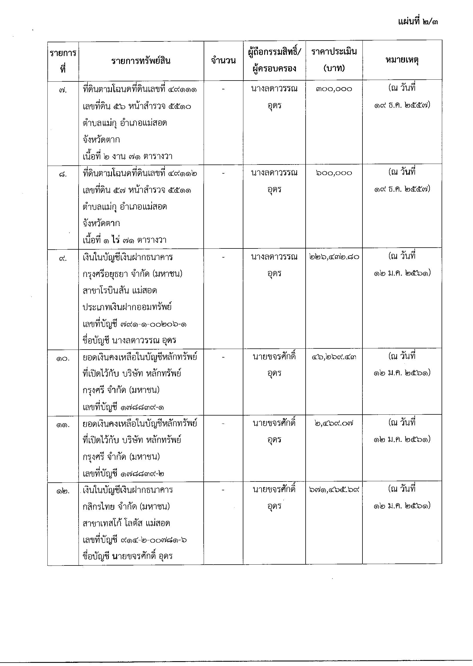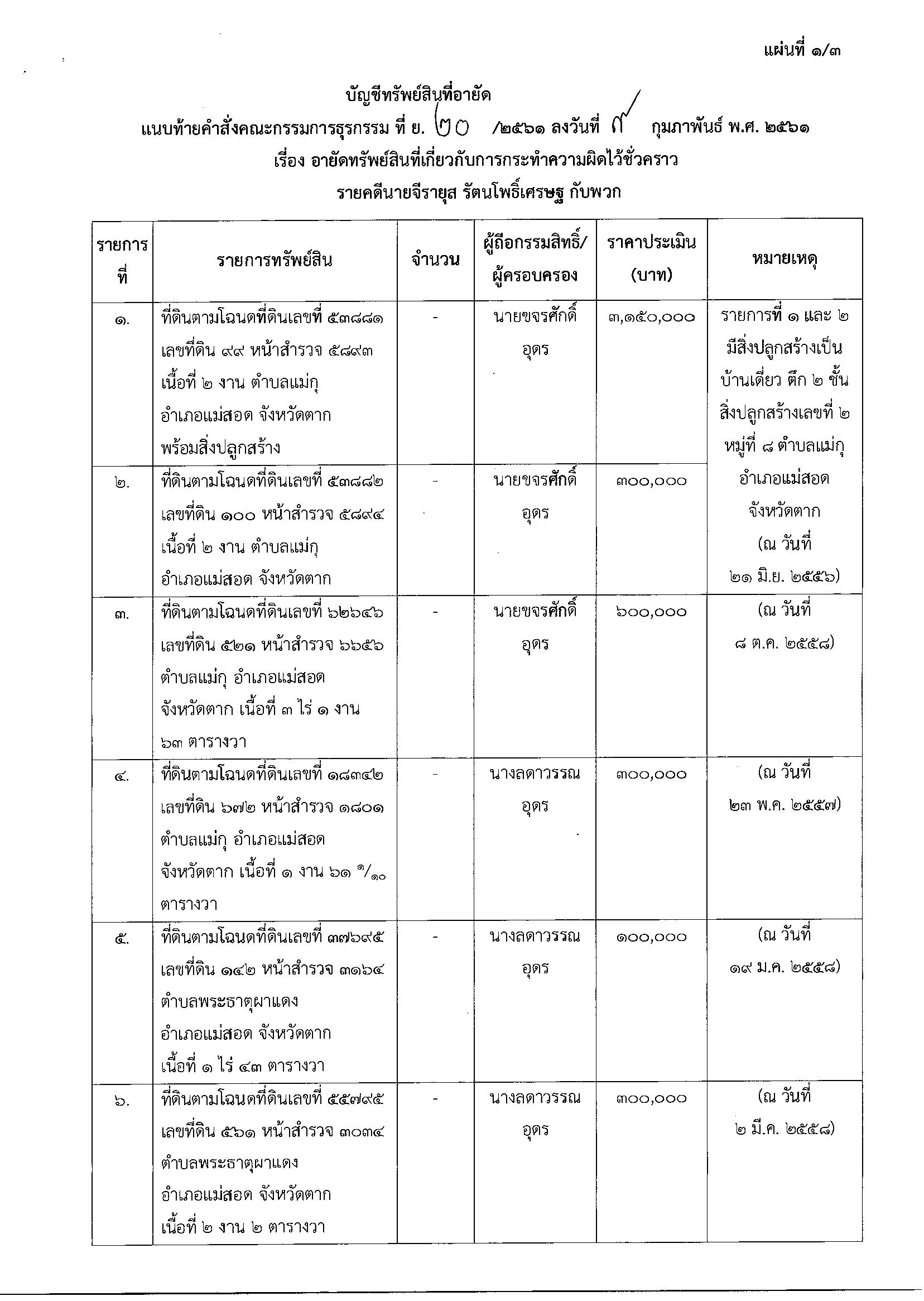 1.ที่ดินใน ต.แม่กุ อ.แม่สอด จ.ตาด ที่อยู่ในชื่อ นายขจรศักดิ์ อุดร จำนวน 3 แปลง ในชื่อนางลดาวรรณ อุดร จำนวน 5 แปลง