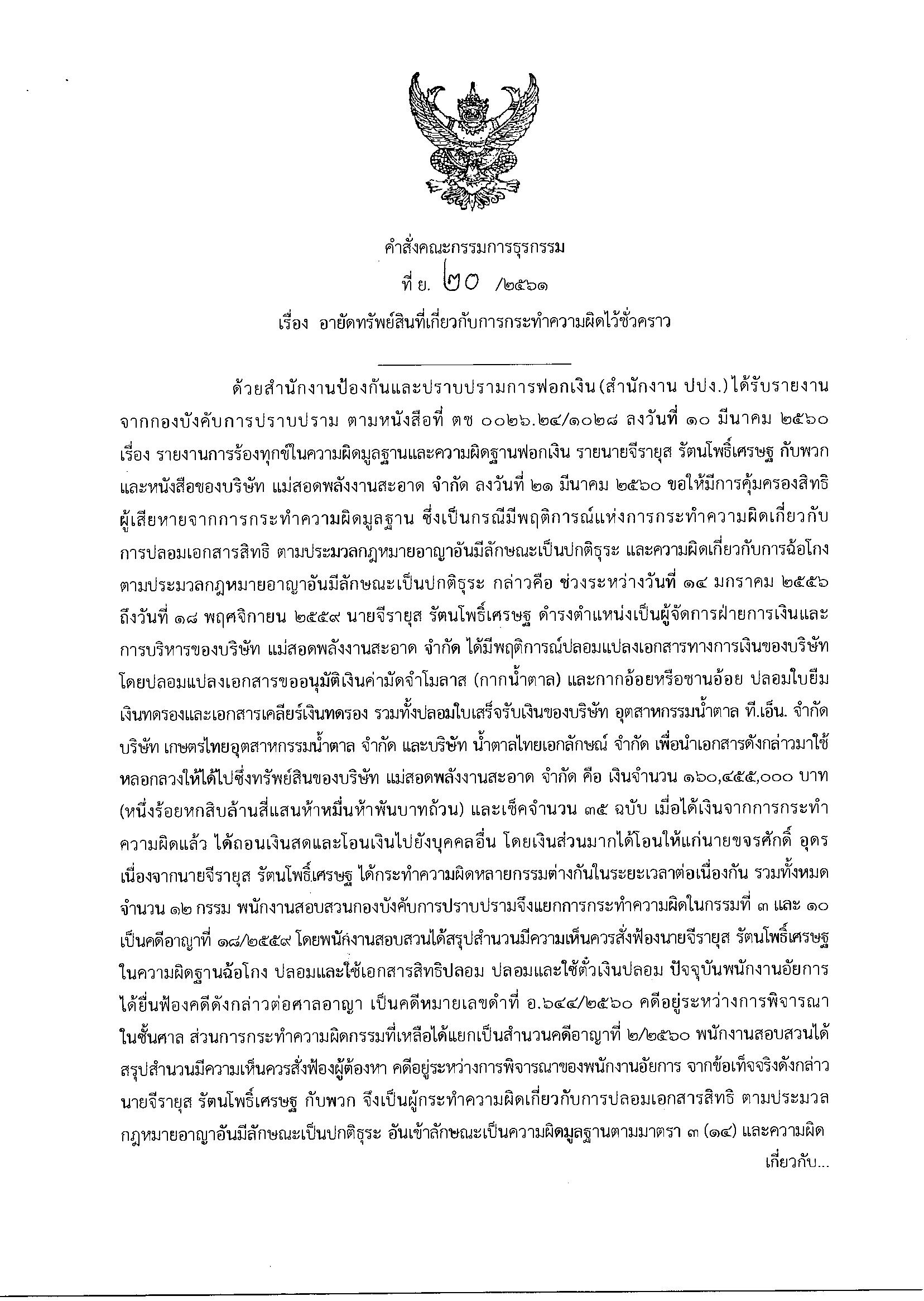 รับลูกตำรวจกองปราบ! ปปง. อายัดทรัพย์ ผู้จัดการ บ.แม่สอดพลังงานสะอาด ตระกูลว่องกุศลกิจน้ำตาลดัง ปลอมเอกสาร ใบยืมเงินทดรอง ใบเสร็จรับเงิน รง.น้ำตาล 3 แห่ง โกง 160.4 ล. เช็ค 35 ฉบับ ถอนเงินสดผ่องถ่ายให้คนใกล้ชิด หุ้น ที่ดิน เงินฝาก รวม 16 รายการ