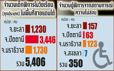 สำหรับเด็กพิการในวัยเรียนทุกประเภทในพื้นที่จังหวัดชายแดนภาคใต้ จำนวน 5,406 คน แยกเป็น จ.ยะลา 1,230 คน จ.ปัตตานี 3,446 คน และ จ.นราธิวาส 1,730 คน ส่วนผู้พิการที่เกิดจากสถานการณ์ความไม่สงบในพื้นที่ มีจำนวน 350 คน แยกเป็น จ.ยะลา 157 คน จ.ปัตตานี 63 คน จ.นราธิวาส 123 คน และ 4 อำเภอของ จ.สงขลา 7 คน