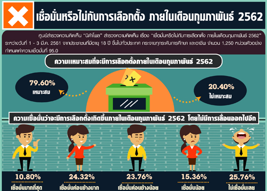 ศูนย์สำรวจความคิดเห็น 'นิด้าโพล' สถาบันบัณฑิตพัฒนบริหารศาสตร์ (นิด้า) เปิดเผยผลสำรวจความคิดเห็นของประชาชน เรื่อง 'เชื่อมั่นหรือไม่กับการเลือกตั้ง ภายในเดือนกุมภาพันธ์ 2562' ทำการสำรวจระหว่างวันที่ 1 – 3 มี.ค. 2561 จากประชาชนที่มีอายุ 18 ปีขึ้นไป กระจายทุกภูมิภาค ระดับการศึกษา และอาชีพทั่วประเทศ รวมทั้งสิ้น จำนวน 1,250 หน่วยตัวอย่าง เกี่ยวกับความเชื่อมั่นต่อการเลือกตั้ง ภายในเดือนกุมภาพันธ์ 2562 การสำรวจอาศัยการสุ่มตัวอย่างด้วยความน่าจะเป็น จากบัญชีรายชื่อฐานข้อมูลตัวอย่างหลัก (Master Sample) ของ “นิด้าโพล” ด้วยวิธีแบบแบ่งชั้นภูมิ (Stratified Random Sampling) โดยแบ่งชั้นภูมิตามภูมิภาค จากนั้นในแต่ละภูมิภาคสุ่มตัวอย่างด้วยวิธีแบบอย่างง่าย (Simple Random Sampling) เก็บข้อมูลด้วยวิธีการสัมภาษณ์ทางโทรศัพท์ โดยกำหนดค่าความเชื่อมั่นที่ ร้อยละ 95.0