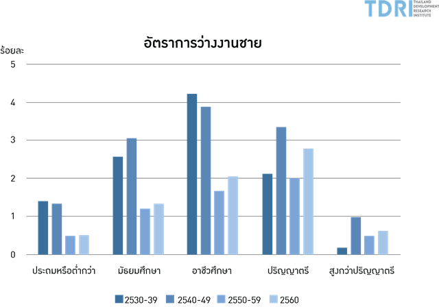 การเพิ่มขึ้นของกำลังแรงงานที่มีการศึกษาสูงได้ทำให้โอกาสในการหางานทำยากขึ้นด้วย โดยปกติเรามักเข้าใจกันว่าอัตราการว่างงานของไทยค่อนข้างต่ำ แต่ถ้าดูอัตราการว่างงานตามระดับการศึกษาของชายและหญิงแล้วจะพบว่ากำลังแรงงานที่มีการศึกษาระดับปริญญาตรีมีอัตราการว่างงานสูงที่สุด ประมาณร้อยละ 2.1 ในปี 2530-2539 เป็นร้อยละ 2.0 ในปี 2550-2559 สำหรับชาย และจากร้อยละ 3.1 เป็นร้อยละ 2.2 สำหรับหญิงในช่วงเวลาเดียวกัน
