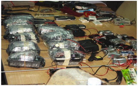 บรรยายภาพ : อุปกรณ์อิเล็กทรอนิกส์และโทรศัพท์เคลื่อนที่ที่ยึดได้จากบ้านพักภายในโรงเรียนอิสลามบูรพา ซึ่งเจ้าหน้าที่เชื่อว่าเป็นอุปกรณ์ประกอบระเบิด