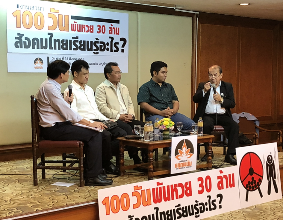 วันที่ 16มีนาคม เวลา10.00น. ที่โรงแรมเอเชีย ในเวทีเสวนา“100 วันพันหวย30ล้าน สังคมไทยเรียนรู้อะไร” จัดโดยมูลนิธิรณรงค์หยุดพนัน เครือข่ายเด็กรุ่นใหม่ไม่พนัน และศูนย์ศึกษาปัญหาการพนัน