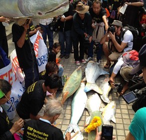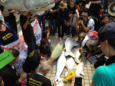 ทั้งนี้เครือข่ายประชาชนได้สวมเสือสีดำ ข้อความ “No Dam Mekong” เพื่อแสดงสัญลักษณ์การไม่เห็นด้วยกับการก่อสร้างเขื่อนไชยะบุรีซึ่งจะสร้างผลกระทบต่อระบบนิเวศน์ลุ่มแม่น้ำโขงทั้งปัญหาน้ำโขงแห้งขอดที่เคยเกิดขึ้นมาแล้วจากการก่อสร้าเขื่อนขนาดใหญ่ขวางลำน้ำโขงในช่วงประเทศจีนโดยเฉพาะช่วงหน้าแล้งที่เขื่อนจำเป็นต้องกักน้ำไว้ผลิตกระแสไฟฟ้า รวมถึงผลกระทบระบบนิเวศน์พันธุ์ปลาซึ่งเป็นแหล่งอาหารของประชากรลุ่มน้ำโขงที่ถูกทำลาย ฯลฯ นอกจากนี้ตัวแทนเครือข่ายจังหวัดต่างๆ ยังสลับขึ้นปราศรัยอธิบายถึงผลกระทบที่จะเกิดขึ้นโดยหญิบยกประเทศผลกระทบต่อความอุดมสมบูรณ์ในระดับภูมิภาคและวิถีชีวิตประชากรลุ่มน้ำโงที่ต้องเปลี่ยนแปลงไป ทั้งนี้เครือข่ายได้ทำหุ่นจำลองพันธุ์ปลาแม่น้ำโขงมาแสดงด้วย อาทิ ปลาบึก ปลาตะเพียน ตลอดจนปลาหายากต่างๆ ก่อนที่ผู้เฒ่าผู้แก่จะทำพิธี “สืบชะตาปลาแม่น้ำโขง” ตามความเชื่อลุ่มน้ำโงแต่โบราณ ที่ด้านหน้าอาคารบริษัท ช.การช่าง จำกัด (มหาชน) และอาคารสำนักงานใหญ่ธนาคารไทยพาณิชย์ ท่ามกลางความสนใจจากสื่อมวลชนหลายเขนง โดยเฉพาะเสื่อต่างประเทศหลายสำนักที่เกาะติดนำเสนอข่าว