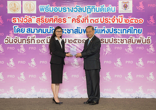 นางสาวน้ำทิพย์ สำเภาประเสริฐ (ซ้าย) ผู้อำนวยการฝ่ายบริหารแบรนด์และกิจการเพื่อสังคม เอสซีจี เคมิคอลส์ เป็นผู้แทนบริษัทฯ เข้ารับมอบรางวัลรองชนะเลิศปฏิทินตั้งโต๊ะดีเด่น ประเภทจรรโลงสังคมและสภาวะแวดล้อมในปัจจุบัน จากพลอากาศเอก ชลิต พุกผาสุข (ขวา) องคมนตรี ประธานในพิธีมอบรางวัลปฏิทินดีเด่น รางวัลสุริยศศิธร ครั้งที่ 38 ประจำปี 2561 จัดโดย สมาคมนักประชาสัมพันธ์แห่งประเทศไทย ณ อาคารหอประชุมกรมประชาสัมพันธ์ กรุงเทพฯ
