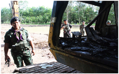 บรรยายภาพ : เจ้าหน้าที่ทหารกำลังตรวจสอบสภาพรถแบ็คโฮที่ถูกคนร้ายลอบเผา ที่ ต.ตาเซะ อ.เมือง จ.ยะลา (ภาพโดย อะหมัด รามันห์สิริวงศ์)