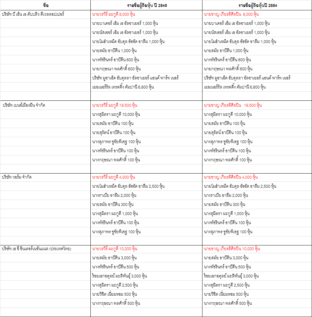 4. บริษัท เอ อี อินเตอร์เนชั่นแนล (ประเทศไทย) พบว่า นายวรวีร์ ได้ยื่นขอลาออกจากกรรมการ และโอนหุ้นทั้งหมดไปให้กับบุคคลคนเดียวทั้งหมด คือ นายชาญ เกียรติศิลปิน