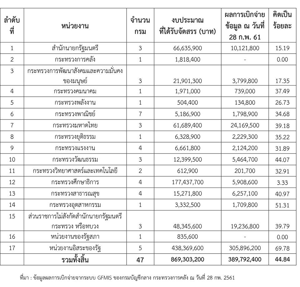 "..สำนักข่าวอิศรา www.isranews.org ตรวจสอบข้อมูลความก้าวหน้าในการดำเนินงานและการเบิกจ่ายงบประมาณ ตามแผนบูรณาการการป้องกันปราบปรามการทุจริตและประพฤติมิชอบ ประจำปีงบประมาณ พ.ศ. 2561 ครั้งที่ 1 (รอบ 6 เดือน) พบว่า มีการเบิกจ่ายงบประมาณไปแล้ว 389,792,400 บาท หรือคิดเป็นร้อยละ 44.84 จากงบประมาณทั้งหมด 869,303,200 บาท ...แต่ที่น่าสังเกตจากตัวเลขที่ออกมา พบว่า มีอยู่ 2 หน่วยงานที่ ยังไม่มีการเบิกจ่ายเงินส่วนนี้เลยแม้แต่บาทเดียว ได้แก่ กระทรวงการคลัง หน่วยงานของรัฐสภา สำนักงานเลขาธิการสภาผู้แทนราษฎร..."