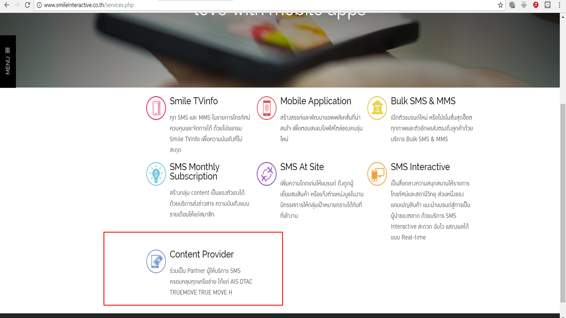 เมื่อสำนักข่าวอิศรา เข้าไปตรวจสอบที่หน้าเว็บไซต์ smileinteractive พบข้อมูลเพิ่มเติมว่า บริษัทสไมล์ อินเทอร์แอคทีฟฯ เป็นพาร์ทเนอร์หรือหุ้นส่วนทางการค้ากับ ผู้ให้บริการ SMS ครอบคลุมทุกเครือข่าย ได้แก่ AIS DTAC TRUEMOVE TRUE MOVE H ด้วย