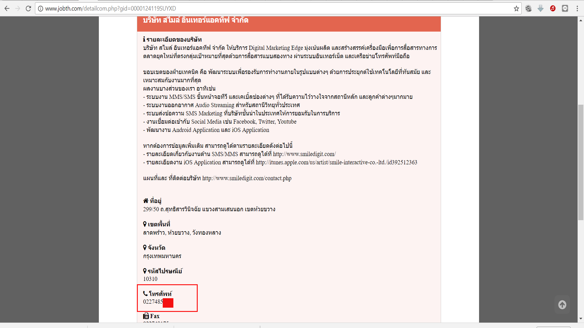 เมื่อสำนักข่าวอิศรา นำเบอร์โทรดังกล่าวไปสืบค้นข้อมูลในโลกออนไลน์ พบข้อมูลในเว็บไซต์ Jobth ซึ่งเป็นเว็บไซต์รับสมัครงาน ระบุว่าเบอร์โทรดังกล่าวว่าเป็นเบอร์ของบริษัทสไมล์ อินเทอร์แอคทีฟ ให้บริการ Digital Marketing Edge มุ่งเน้นผลิต และสร้างสรรค์เครื่องมือเพื่อการสื่อสารทางการตลาดยุคใหม่ที่ตรงกลุ่มเป้าหมายที่สุดด้วยการสื่อสารแบบสองทาง ผ่านระบบอินเทอร์เน็ต และเครือข่ายโทรศัพท์มือถือ และมีผลงานที่ผ่านมา อาทิ ระบบงาน MMS/SMS ขึ้นหน้าจอทีวี และเคเบิ้ลช่องต่างๆ, ระบบงานออกอากาศ Audio Streaming สำหรับสถานีวิทยุทั่วประเทศ, ระบบส่งข้อความ SMS Marketing ให้บริษัทชั้นนำในประเทศ ,งานเชื่อมต่อเข้ากับ Social Media เช่น Facebook, Twitter, Youtube ,การเขียน Android Application และ iOS Application