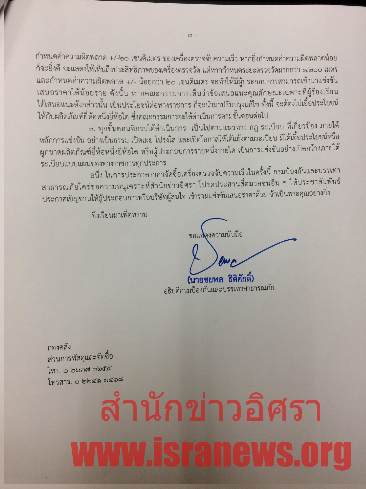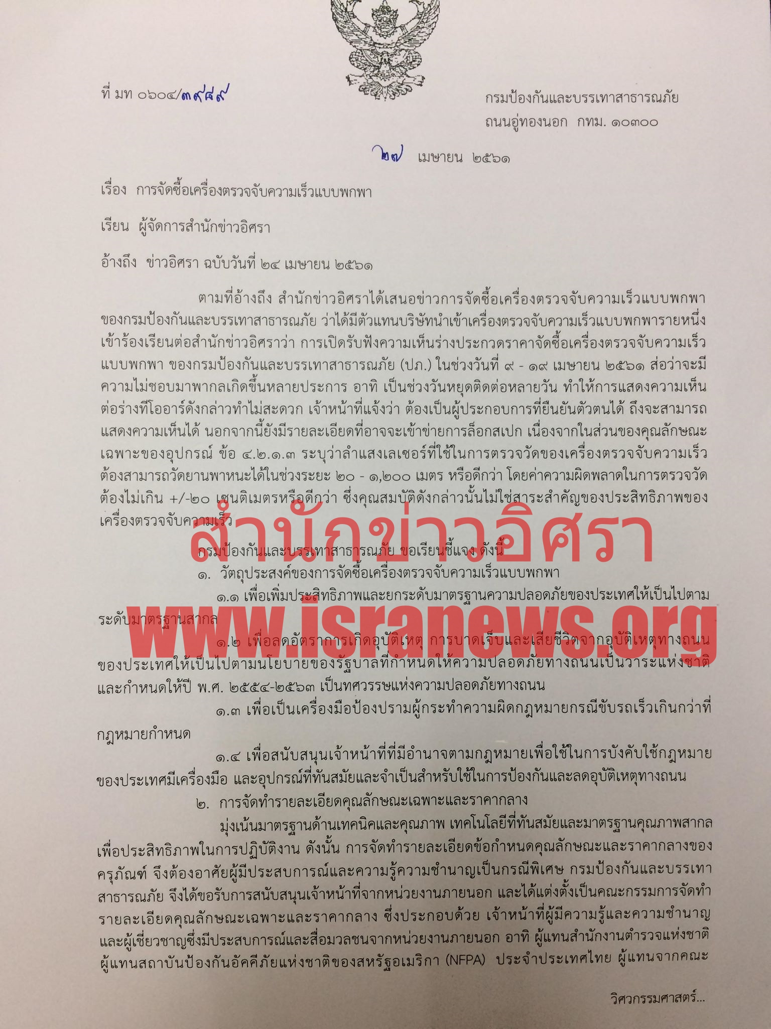 สืบเนื่องจากสำนักข่าวอิศรา www.isranews.org นำเสนอข่าวกรณีผู้ประกอบการธุรกิจนำเข้าเครื่องตรวจจับความเร็วแบบพกพาร้องเรียนถึงความไม่ชอบมาพากลในการจัดทำร่างเอกสารข้อกำหนดเงื่อนไขการจัดซื้อจัดจ้าง (TOR) เครื่องตรวจจับความเร็วแบบพกพา ของกรมป้องกันและบรรเทาสาธารณภัย (ปภ.) มูลค่า 573 ล้านบาท อาทิ การเปิดรับฟังความคิดเห็นต่อร่าง TOR ช่วงวันหยุดสงกรานต์หลายวันคือตั้งแต่วันที่ 9-19 เม.ย. การกำหนดคุณลักษณะเฉพาะอุปกรณ์ตรวจจับความเร็วที่ระบุในทีโออาร์ในข้อ 4.2.1.3 ระบุว่าลำแสงเลเซอร์ที่ใช้ในการตรวจวัดของเครื่องตรวจจับความเร็ว ต้องสามารถวัดยานพาหนะได้ในช่วงระยะ 20-1,200 เมตร หรือดีกว่านั้น (อ่านประกอบ:หวั่นTORเครื่องตรวจความเร็ว573ล.ล็อกสเปก! เอกชนข้องใจเปิดรับฟังความเห็นวันหยุดสงกรานต์)