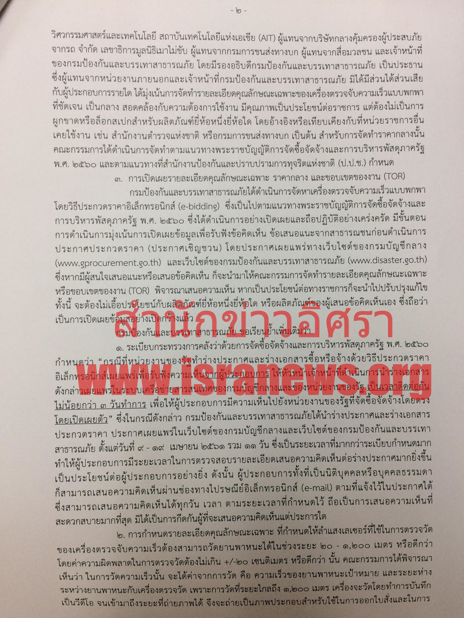 ปภ.ส่งหนังสือโต้ข้อกล่าวหาปมล็อกสเปก TOR เครื่องตรวจจับความเร็ว ยัน ทำตามระเบียบทุกอย่าง เปิดโอกาสให้แสดงความเห็นถึง 11 วัน ชี้กำหนดค่าผิดพลาด +/- 20 ซ.ม. เป็นเรื่องสำคัญ ไม่เอื้อประโยชน์ผลิตภัณฑ์ยี่ห้อใดยี่ห้อหนึ่ง