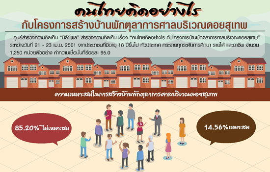 ศูนย์สำรวจความคิดเห็น 'นิด้าโพล' สถาบันบัณฑิตพัฒนบริหารศาสตร์ (นิด้า) เปิดเผยผลสำรวจความคิดเห็นของประชาชนเรื่อง “คนไทยคิดอย่างไร กับโครงการสร้างบ้านพักตุลาการศาลบริเวณดอยสุเทพ” ทำการสำรวจระหว่างวันที่ 21 – 23 เม.ย. 2561 จากประชาชนที่มีอายุ 18 ปีขึ้นไป กระจายทุกภูมิภาค ระดับการศึกษา และอาชีพทั่วประเทศ รวมทั้งสิ้น จำนวน 1,250 หน่วยตัวอย่างเกี่ยวกับโครงการสร้างบ้านพักตุลาการศาลบริเวณดอยสุเทพ การสำรวจอาศัยการสุ่มตัวอย่างด้วยความน่าจะเป็นจากบัญชีรายชื่อฐานข้อมูลตัวอย่างหลัก (Master Sample) ของ 'นิด้าโพล' ด้วยวิธีแบบแบ่งชั้นภูมิ (Stratified Random Sampling) โดยแบ่งชั้นภูมิตามภูมิภาค จากนั้นในแต่ละภูมิภาคสุ่มตัวอย่างด้วยวิธีแบบอย่างง่าย (Simple Random Sampling) เก็บข้อมูลด้วยวิธีการสัมภาษณ์ทางโทรศัพท์ โดยกำหนดค่าความเชื่อมั่นที่ ร้อยละ 95.0