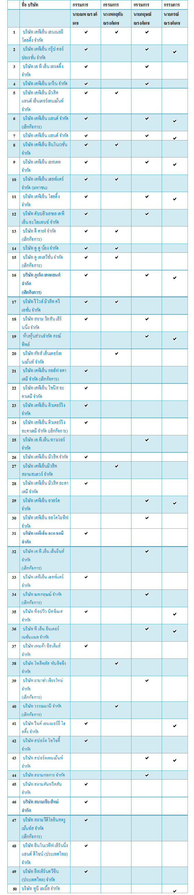 26. บริษัท เคพีเอ็น เฮลท์แคร์ จำกัด 27. บริษัท ท็อปวิว บิสซิเนส จำกัด 28. บริษัท เพนต้า ซิสเต็มส์ จำกัด 29.บริษัท วินด์ เอนเนอร์ยี่ โฮลดิ้ง จำกัด 30. บริษัท สปอร์ต โซไซตี้ จำกัด