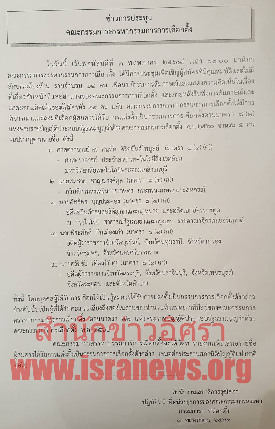 สำนักข่าวอิศรา www.isranews.org รายงานว่า เมื่อวันที่ 3 พ.ค.61 คณะกรรมการการเลือกตั้ง (กกต.) มีการประชุมเพื่อเชิญผู้สมัครที่มีคุณสมบัติและไม่มีลักษณะต้องห้ามเข้าแสดงความเห็นเรื่องอำนาจหน้าที่ของ กกต. โดยภายหลังการรับฟังความคิดเห็นจากผู้สมัครทั้ง 24 คนแล้ว กกต.ได้พิจารณาและลงมติเลือกผู้ที่สมควรได้รับการแต่งตั้งเป็น กกต. ตามมาตรา 8 แห่ง พ.ร.บ.ประกอบรัฐธรรมนูญว่าด้วย กกต. จำนวน 5 คน ประกอบไปด้วย
