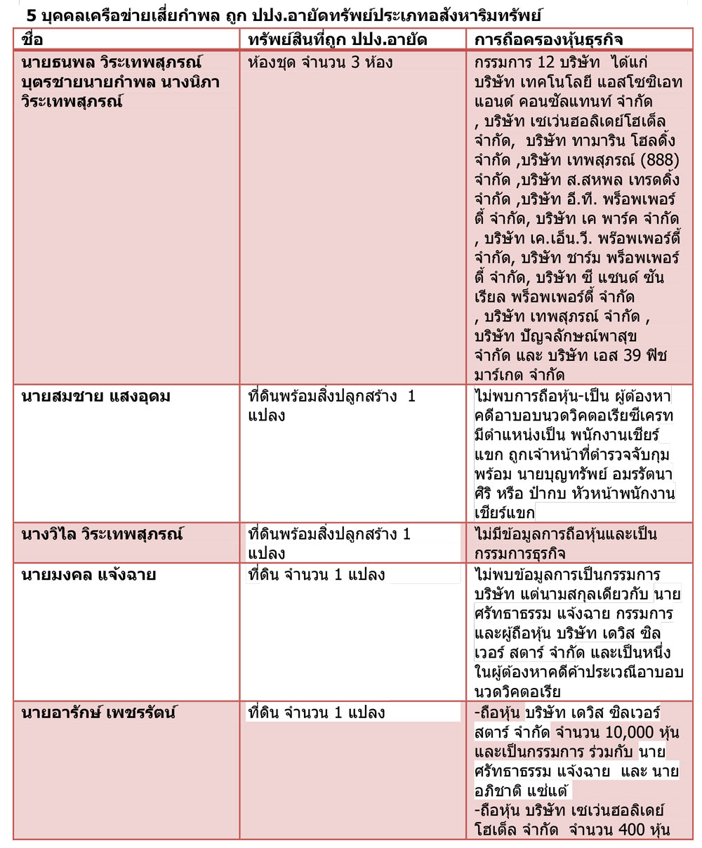 5 บุคคลที่ถูกคณะกรรมการธุรกรรมในคณะกรรมการป้องกันและปราบปรามการฟอกเงิน (ปปง.) มีมติในการประชุมครั้งที่ 9/2561 เมื่อวันที่ 8 พ.ค. 2561 ให้ยึดอายัด อสังหาริมทรัพย์ ทรัพย์สินประเภทที่ดิน สิ่งปลูกสร้าง และห้องชุด จำนวน 8 รายการ 6 ราย (จากทั้งหมด 3 ประเภท 45 รายการ มูลค่า 470 ล้านบาท) คือ