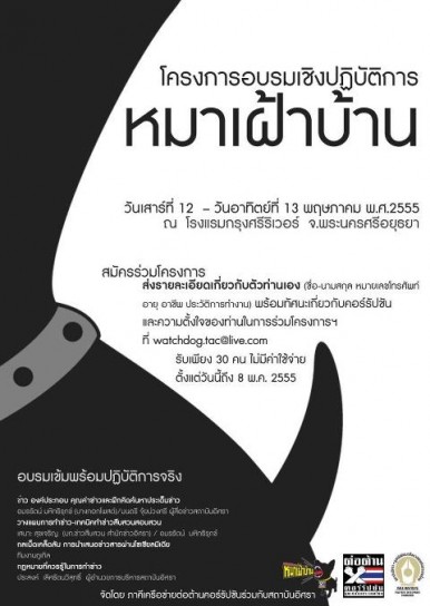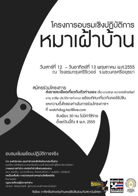 ภาคีเครือข่ายต่อต้านคอร์รัปชันร่วมกับสถาบันอิศรา เชิญร่วมโครงการอบรมเชิงปฏิบัติการหมาเฝ้าบ้าน ระหว่างวันที่ 12–13 พฤษภาคม 2555 ณ โรงแรมกรุงศรีริเวอร์ จ.พระนครศรีอยุธยา