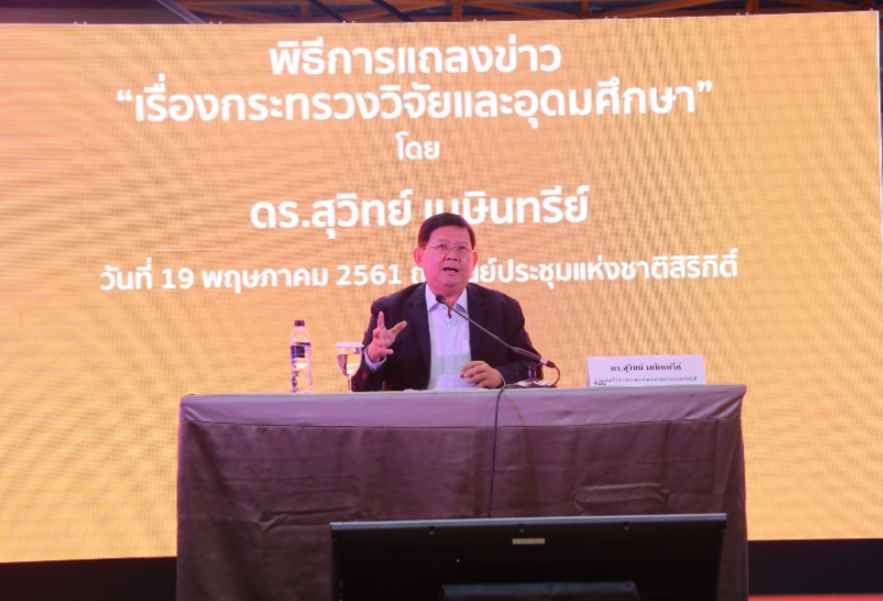 เมื่อวันที่ 19 พ.ค.ที่ศูนย์ประชุมแห่งชาติสิริกิติ์ ดร.สุวิทย์ เมษินทรีย์ รมว.วิทยาศาสตร์และเทคโนโลยี(วท.) แถลงข่าวในงานสตาร์ทอัพไทยแลนด์ ประจำปี 2561 เรื่อง “กระทรวงวิจัยและอุดมศึกษา” ว่า ขณะนี้ มีความสับสนกรณีการยุบกระทรวงวิทยาศาสตร์ฯ ขอชี้แจงว่า จะไม่มีการยุบกระทรวงวิทยาศาสตร์ฯ แต่จะมีการควบรวมกระทรวงวิทยาศาสตร์ฯ กับ สำนักงานคณะกรรมการอุดมศึกษา(สกอ.)และหน่วยงานให้ทุนวิจัยของประเทศทั้งหมด อาทิ สำนักงานคณะกรรมการวิจัยแห่งชาติ(วช.) สำนักงานกองทุนสนับสนุนการวิจัย(สกว.) เป็นต้น มาเป็นกระทรวงใหม่ เบื้องต้นชื่อ "กระทรวงวิจัยและอุดมศึกษา หรืออาจจะเป็นกระทรวงวิทยาศาสตร์ เทคโนโลยีและอุดมศึกษา" ก็ได้ โดยการควบรวมดังกล่าวเป็นไปตามนโยบายปฎิรูปประเทศตามยุทธศาสตร์ชาติ 20 ปี และปฎิรูปประเทศไทยสู่ 4.0
