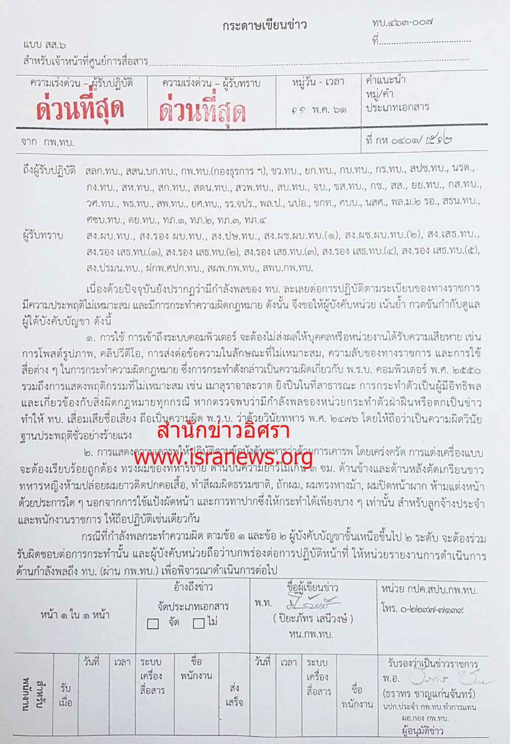 ทั้งนี้ สำนักข่าวอิศรา www.isranews.org รายงานว่า ล่าสุดเมื่อวันที่ 11 พ.ค.2561 กองทัพบกได้ส่งหนังสือด่วนที่สุดถึงหน่วยผู้รับปฏิบัติเข้มงวดวินัยกำลังพล ในเรื่องพฤติกรรมการแสดงออกต่อสาธารณะและวินัยส่วนบุคคล 2 ประการ ระบุว่า