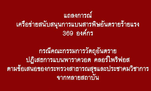 ผู้สื่อข่าวสำนักข่าวอิศรา www.isranews.org รายงานว่า เครือข่ายสนับสนุนการแบนสารพิษที่มีอันตรายร้ายแรง 369 องค์กร ออกแถลงการณ์มีรายละเอียดดังนี้ ขอแสดงความเสียใจต่อประชาชนไทยที่การลงมติของคณะกรรมการวัตถุอันตราย ปฏิเสธการยกเลิกสารพิษร้ายแรง ทั้งพาราควอต และคลอร์ไพริฟอส ตามข้อเสนอของกระทรวงสาธารณสุขและคณะทำงานจาก 4 กระทรวงหลัก รวมทั้งประชาคมวิชาการจากหลายสถาบัน เป็นการตัดสินใจทางนโยบายที่เอื้ออำนวยประโยชน์ต่อกลุ่มผู้ค้าสารพิษ โดยไม่คำนึงถึงผลกระทบต่อสุขภาพของประชาชนและสิ่งแวดล้อมโดยรวม สวนทางกับนโยบายของรัฐบาลที่ประกาศว่าจะนำพาประเทศไปสู่การพัฒนาที่ยั่งยืน