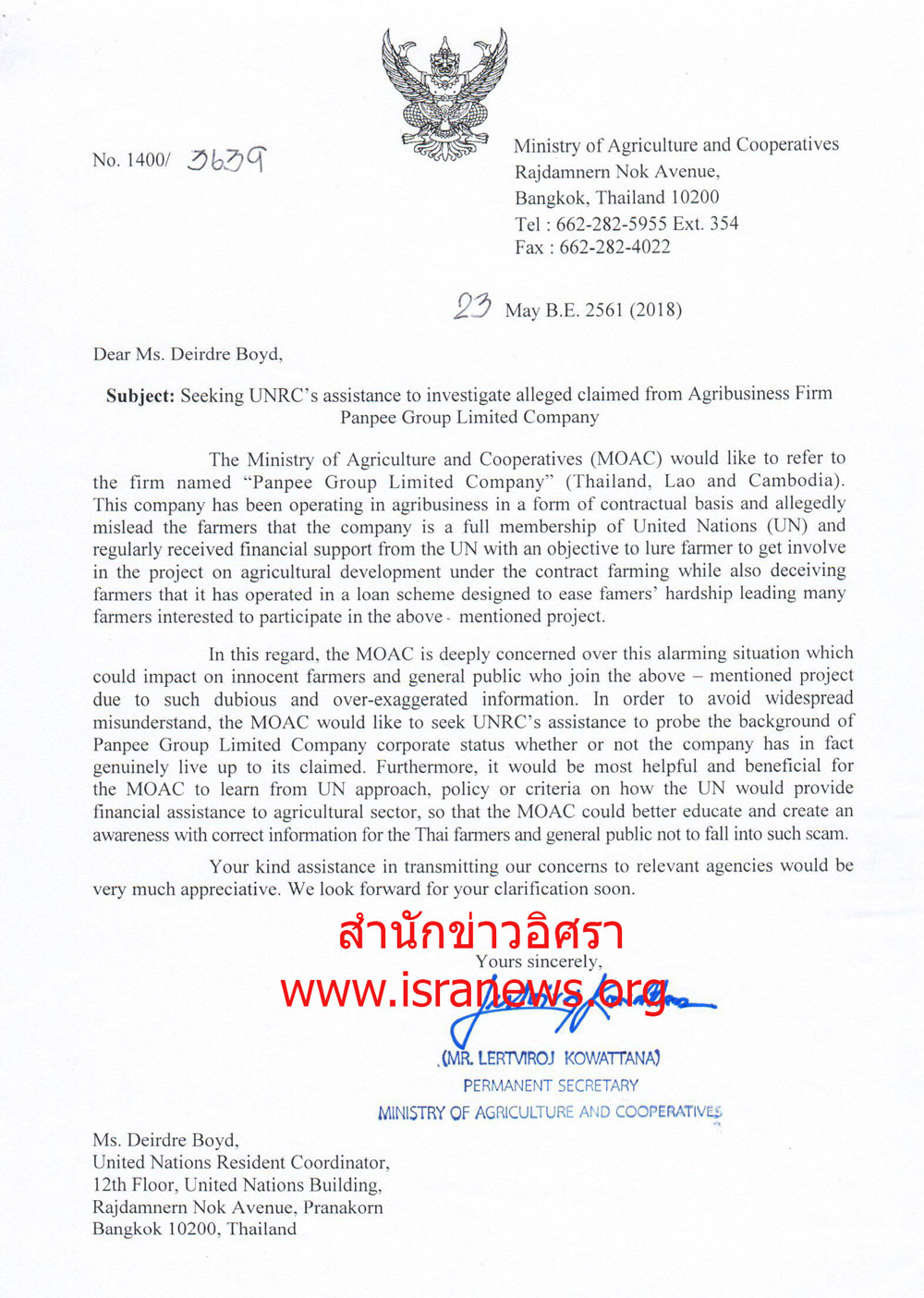 ล่าสุด แหล่งข่าวระดับสูงจากกระทรวงเกษตรฯ เปิดเผยสำนักข่าวอิศรา ว่า ขณะนี้หนังสือของ นายเลิศวิโรจน์ โกวัฒนะ ปลัดกระทรวงเกษตรฯ ที่ลงนามถึง องค์การสหประชาชาติ (ยูเอ็น) ได้ถูกส่งออกไปจากกระทรวงเกษตรฯ แล้ว โดยทำถึง นาย Deirdre Boyd ผู้ประสานงานสหประชาชาติประจำประเทศไทย เนื้อหาในหนังสือฉบับดังกล่าว ระบุว่า กระทรวงเกษตรฯ ใคร่ขออ้างถึง บริษัท พันปี กรุ๊ป (ไทย ลาว กัมพูชา) จำกัด ซึ่งประกอบกิจการประเภทธุรกิจการเกษตร โดยมีการประกอบธุรกิจในลักษณะรูปแบบของการทำสัญญา และถูกกล่าวอ้างว่ามีการแสดงเจตนาฉ้อฉลต่อเกษตรกร โดยอ้างว่าเป็นสมาชิกอย่างเต็มรูปแบบขององค์การสหประชาชาติ (UN) และได้รับการสนับสนุนทางด้านการเงินอย่างสม่ำเสมอจากองค์การสหประชาชาติ โดยการกระทำดังกล่าวนั้นมุ่งหวังที่จะล่อลวงเกษตรกรให้เข้าร่วมกับโครงการพัฒนาทางด้านการเกษตร ในรูปแบบของเกษตรพันธสัญญา และในขณะเดียวกันยังได้หลอกลวงแก่เกษตรกรว่า บริษัทได้มีการดำเนินโครงการให้กู้ยืมเพื่อช่วยเหลือทางด้านความขาดแคลนของเกษตรกร ส่งผลให้ชาวเกษตรกรให้ความสนใจที่จะเข้าร่วมโครงการดังที่ได้กล่าวไปข้างต้น