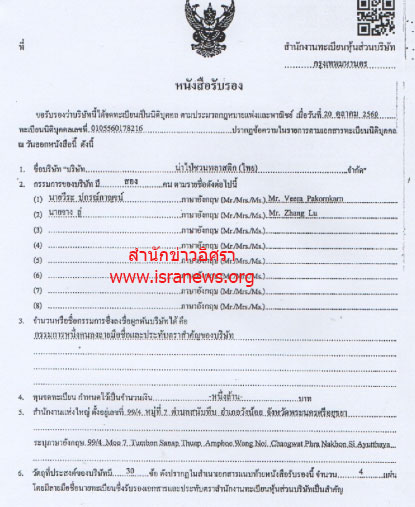 1 ธ.ค.2560 ย้ายที่ตั้งเลขที่ 99/4 หมู่ที่ 7 ต.สนับทึบ อ.วังน้อย จ.พระนครศรีอยุธยา ณ วันที่ 30 พ.ย. 2560 นายวีระ ปกรณ์กาญจน์ ถือ 508 หุ้น (50.80 %) นาย จาง ลู่ สัญชาติจีน 490 หุ้น (49%) นายสุวิทย์ ผายชัยภูมิ น.ส.อารีรัตน์ กับดิ๊บ คนละ 1 หุ้น รวม 1,000 หุ้น มูลค่าหุ้นละ 1,000 บาท นายวีระ ปกรณ์กาญจน์ และ นาย จาง ลู่ เป็นกรรมการ