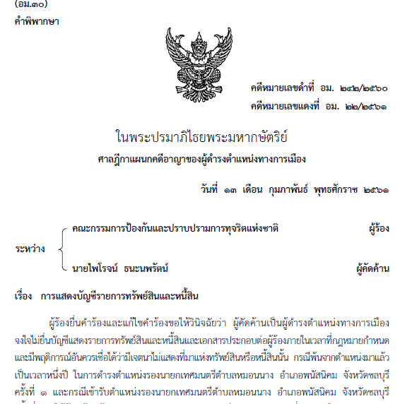 4. นายไพโรจน์ ธนะนพรัตน์ รองนายกเทศมนตรี ต. หมอนนาง อ.พนัสนิคม จ.ชลบุรี จงใจไม่ยื่นบัญชีฯ กรณีพ้นจากตำแหน่งมาแล้วเป็นเวลาหนึ่งปี ในการดำรงตำแหน่งรองนายกเทศมนตรี ต.หมอนนาง ครั้งที่ 1 และกรณีเข้ารับตำแหน่งรองนายกเทศมนตรี ต. หมอนนาง ครั้งที่ 2 ห้ามมิให้ผู้คัดค้านดำรงตำแหน่งทางการเมืองหรือดำรงตำแหน่งใด ในพรรคการเมืองเป็นเวลาห้าปีนับแต่วันที่ 15 ม.ค.2559 ซึ่งเป็นวันที่ผู้คัดค้านพ้นจากตำแหน่ง รองนายกเทศมนตรี ต. หมอนนาง ครั้งที่ 2 และให้ผู้คัดค้านพ้นจากตำแหน่ง รองนายกเทศมนตรี ต. หมอนนาง ครั้งที่ 3 ที่ดำรงอยู่ในปัจจุบันนับแต่วันที่ 13 ก.พ.2561 ซึ่งเป็นวันที่ศาลฎีกาแผนกคดีอาญาของผู้ดำรงตำแหน่งทางการเมืองวินิจฉัย กับมีความผิดตามพระราชบัญญัติ ประกอบรัฐธรรมนูญว่าด้วยการป้องกันและปราบปรามการทุจริต พ.ศ. 2542 มาตรา 119 ฐานเป็นเจ้าหน้าที่ของรัฐจงใจไม่ยื่นบัญชีแสดงรายการทรัพย์สินและหนี้สินและเอกสารประกอบต่อคณะกรรมการ ป.ป.ช. ภายในเวลาที่กฎหมายกำหนด กรณีเข้ารับตำแหน่งรองนายกเทศมนตรี ต.หมอนนาง ครั้งที่ 2 จำคุก 2 เดือน และปรับ 8,000 บาท ผู้คัดค้านให้การรับสารภาพ เป็นประโยชน์แก่การพิจารณา มีเหตุบรรเทาโทษ ลดโทษให้กึ่งหนึ่ง คงจำคุก 1 เดือน และปรับ 4,000 บาท ไม่ปรากฏว่าผู้คัดค้านเคยได้รับโทษจำคุกมาก่อน โทษจำคุกจึงให้รอการลงโทษไว้ มีกำหนด 1 ปี (คดีหมายเลขแดงที่ อม.22/2561-13 ก.พ.2561)