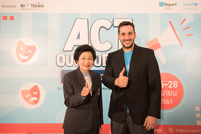 องค์การทุนเพื่อเด็กแห่งสหประชาชาติ ประจำประเทศไทย หรือ ยูนิเซฟ ร่วมกับภาควิชาศิลปะการแสดง คณะนิเทศศาสตร์ มหาวิทยาลัยกรุงเทพ เปิดตัวค่ายละคร “Act Out Loud x U-Report ตอน เสียงของเยาวชน” เพื่อส่งเสริมสิทธิในการแสดงออกทางความคิด และปลูกฝังการเป็นพลเมืองที่มีส่วนร่วมในสังคมแก่เยาวชนคนรุ่นใหม่ ผ่านศิลปะการแสดงหลายแขนง อาทิ ละครเพลง นาฏศิลป์ และละครประยุกต์ร่วมสมัย เมื่อวันที่ 30 พ.ค. 2561