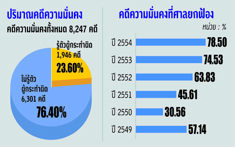 ย้อนกลับไปตั้งแต่ปี 2549 เป็นต้นมาจนถึงปัจจุบัน มีเพียง 2 ปีเท่านั้นที่คดีความมั่นคงมีอัตราส่วนที่ศาลพิพากษาลงโทษเกินกว่าครึ่งหนึ่ง หรือร้อยละ 50 นั่นคือปี 2550 มีคดีที่ศาลพิพากษาจำนวน 36 คดี ยกฟ้อง 11 คดี คิดเป็นร้อยละ 30.56 พิพากษาลงโทษ 25 คดี คิดเป็นร้อยละ 69.44 อีกปีหนึ่งคือปี 2551 มีคดีที่ศาลพิพากษาจำนวน 57 คดี ยกฟ้อง 26 คดี คิดเป็นร้อยละ 45.61 พิพากษาลงโทษ 29 คดี คิดเป็นร้อยละ 50.88
