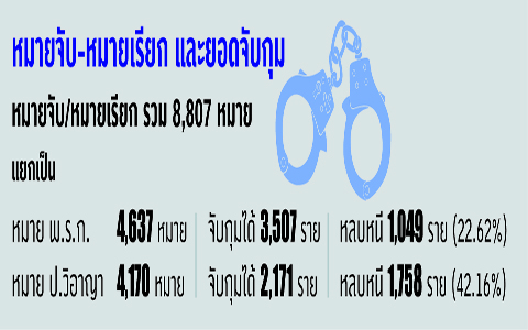 บรรยายภาพ : 1-2 อินโฟร์กราฟฟิกแสดงสถิติการออกหมายจับและหมายเรียกประเภทต่างๆ รวมทั้งสถิติคดีความมั่นคง