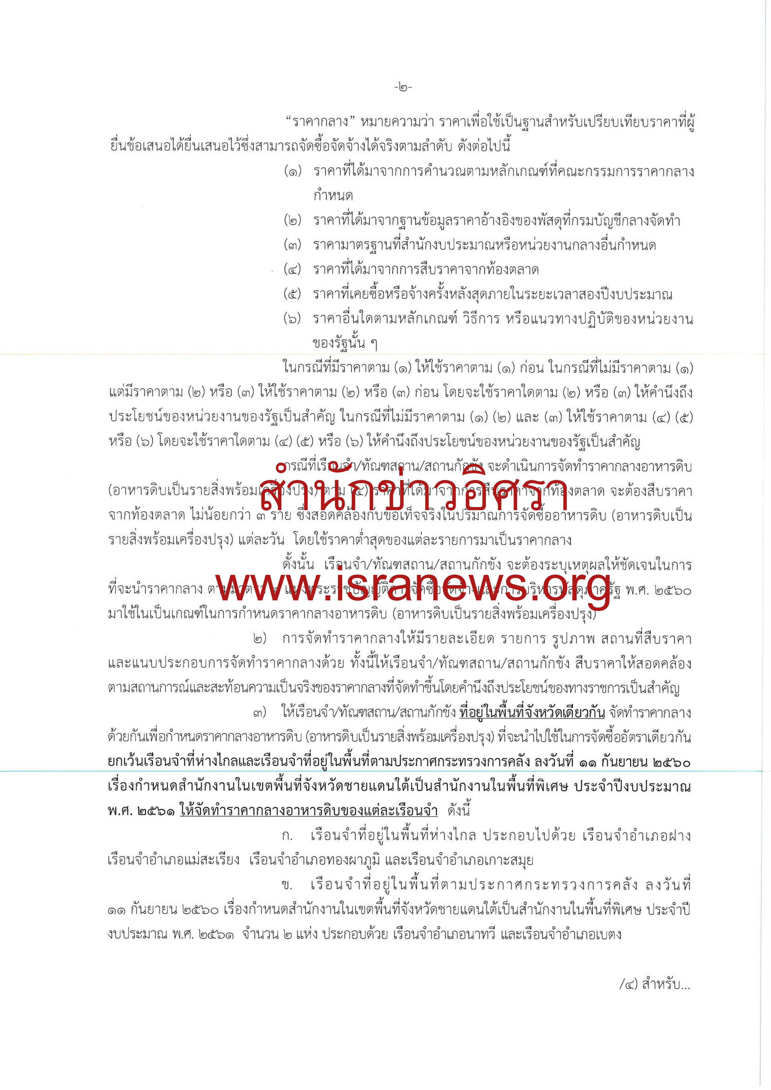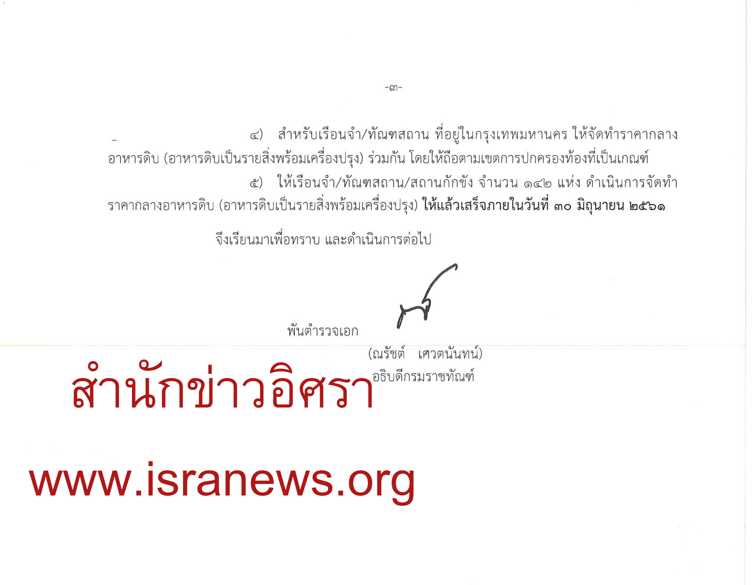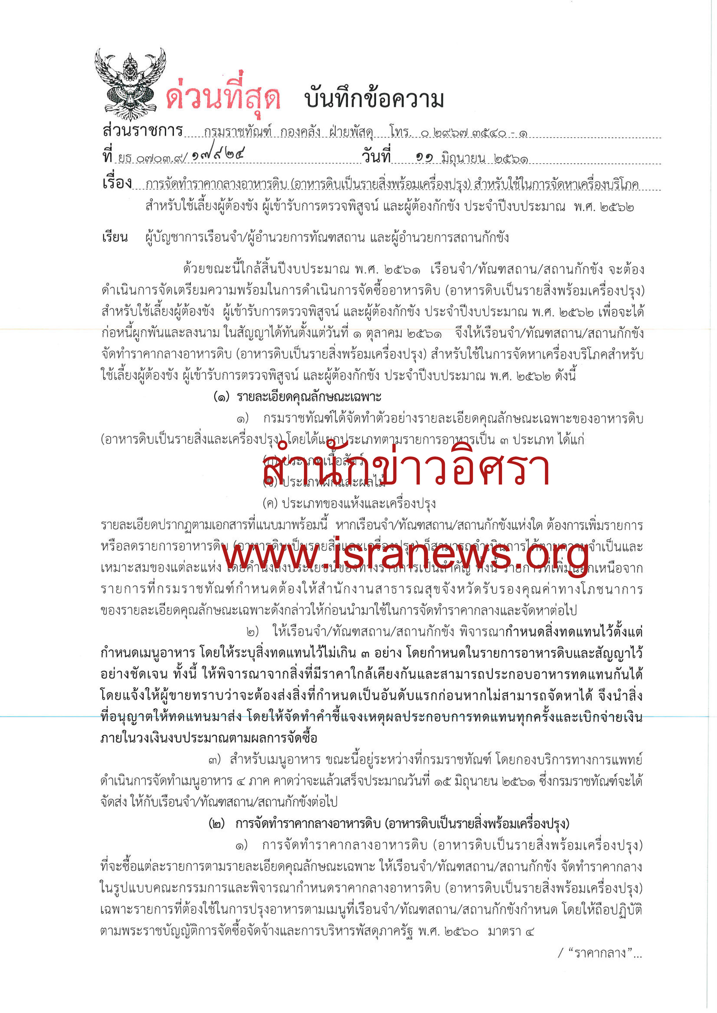 อธิบดีกรมราชทัณฑ์ส่งหนังสือแจ้ง 142 ผบ. กำหนดแนวทางจัดทำราคากลางจัดซื้ออาหารดิบปีงบฯ 62 กำหนดให้เรือนจำในพื้นที่จังหวัดเดียวกัน จัดทำด้วยกัน กรณีสืบจากท้องตลาดต้องไม่น้อยกว่า 3 ราย คำนึงประโยชน์รัฐเป็นหลัก