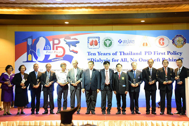 ที่อิมแพค เอ็กซิบิชั่น เซ็นเตอร์ เมืองทองธานี เมื่อวันที่ 22 มิ.ย. 2561 ได้มีการจัดงานประชุมวิชาการหนึ่งทศวรรษการพัฒนาคุณภาพบริการล้างไตผ่านช่องท้อง (10 Years of Thailand PD First Policy “Dialysis for All, No one Left Behind”) พร้อมมอบรางวัล “ผู้ริเริ่มนโยบาย PD FIRST POLICY (การล้างไตช่องท้องเป็นทางเลือกแรก) ในประเทศไทย ที่สามารถช่วยชีวิตผู้ป่วยไตวายเรื้อรังระยะสุดท้ายได้มากกว่า 80,000 รายจนถึงปัจจุบัน” จัดโดยสมาคมโรคไตแห่งประเทศไทย ร่วมกับกระทรวงสาธารณสุข สำนักงานหลักประกันสุขภาพแห่งชาติ สมาคมพยาบาลโรคไต ชมรมโรคไตเด็กแห่งประเทศไทย และสมาคมกำหนดอาหารแห่งประเทศไทย โดยมีแพทย์และพยาบาล ตลอดจนบุคลากรที่เกี่ยวข้องกับการบริการล้างไตผ่านช่องท้องจากทั่วประเทศเข้าร่วม