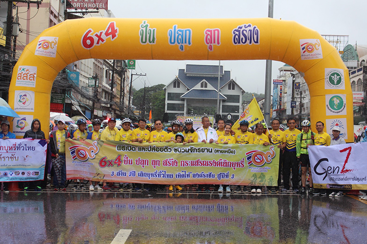 เมื่อวันที่ 27 มิ.ย. 2561 เวลา 08.00 น. ที่บริเวณหน้าด่านชายแดน อ.แม่สาย จ.เชียงราย นพ.ธงชัย เลิศวิไลรัตนพงศ์ ผู้ตรวจราชการกระทรวงสาธารณสุข เป็นประธานเปิดกิจกรรม “6 x 4 รวมใจ ปั่น ปลุก ลุก สร้างกระแสรณรงค์โครงการ 3 ล้าน 3 ปีเลิกบุหรี่ทั่วไทยเทิดไท้องค์ราชัน ปีที่ 3”ภายใต้แนวคิด “ปั่นปอดยิ้ม” โดยมี กระทรวงสาธารณสุข(สธ.)ร่วมกับ สำนักงานกองทุนสนับสนุนการสร้างเสริมสุขภาพ(สสส.) สมาคมหมออนามัย สมาคมสาธารณสุขแห่งประเทศไทย มูลนิธิเครือข่ายหมออนามัย สมาคมวิชาชีพสาธารณสุข และชมรมอาสาสมัครสาธารณสุขประจำหมู่บ้าน ร่วมเป็นเจ้าภาพ โดยมีนักปั่นและผู้ร่วมงานกว่า500คน