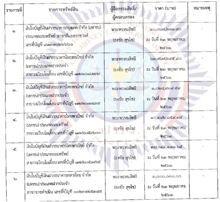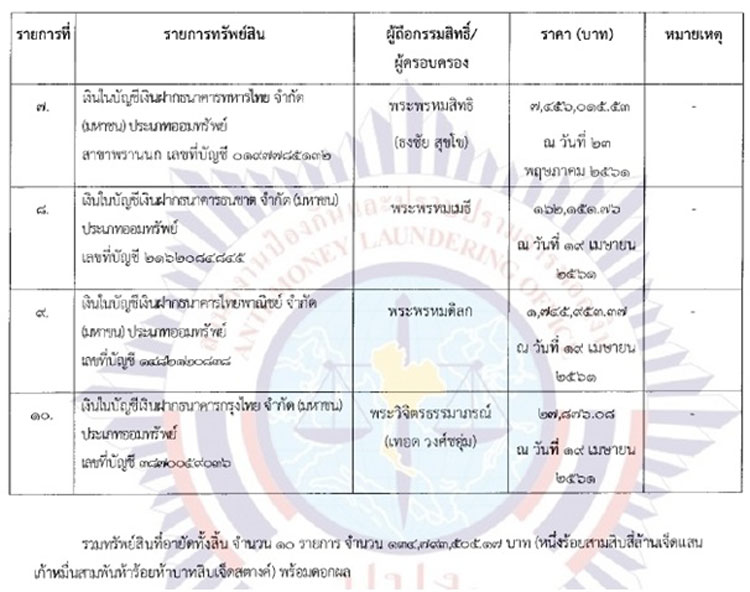 เปิดคำสั่ง ปปง.อายัดบัญชีเงินฝาก 4 อดีตพระผู้ใหญ่คดีเงินทอนวัด 10 บัญชี 134.7 ล. พระพรหมสิทธิรายเดียว 132ล.