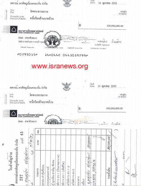 หนึ่ง เช็คที่จ่าย พระราชภาวนาวิสุทธิ์ (ชื่อเดิมหลวงพ่อธัมมชโย ปัจจุบันคือพระเทพญาณมหามุนี) และวัดพระธรรมกาย โดยตรง 4 ใบ รวม 316,780,000 บาท (ดูเอกสารประกอบท้ายข่าว)