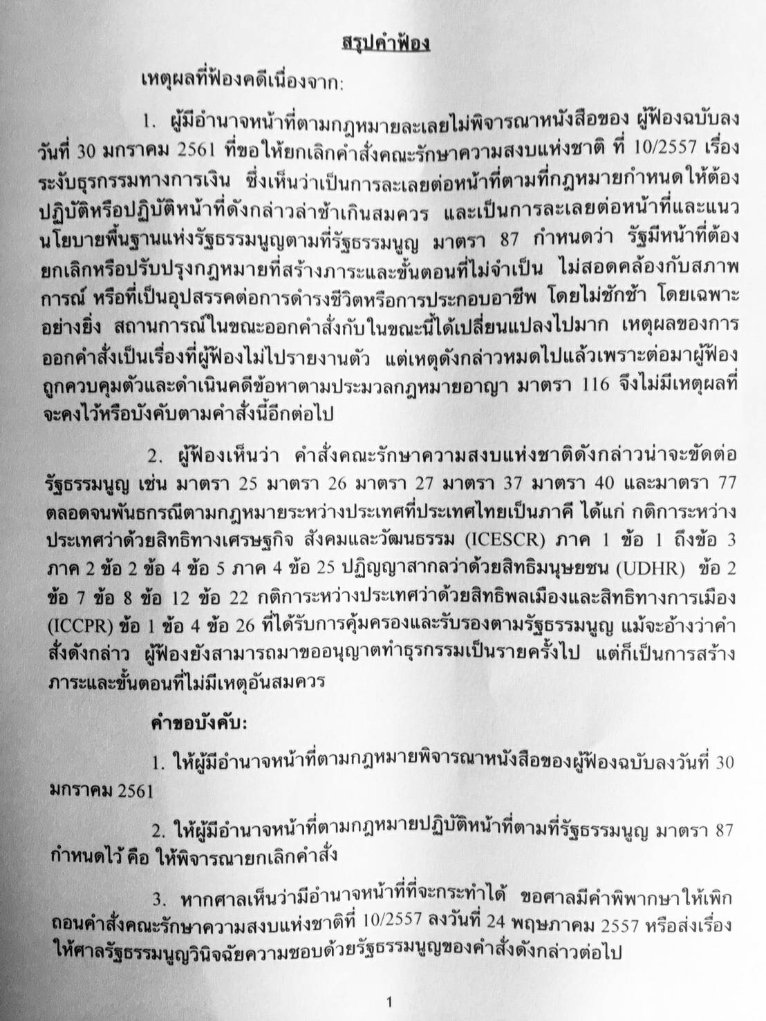 1.ผู้มีอำนาจหน้าที่ตามกฎหมายละเลยไม่พิจารณาหนังสือของผู้ฟ้องฉบับลงวันที่ 30 ม.ค.2561 ที่ขอให้ยกเลิกคำสั่งคณะรักษาความสงบแห่งชาติ (คสช.)ที่ 10/2557 เรื่องระงับธุรกรรมทางการเงิน ซึ่งเห็นว่าเป็นการละเลยต่อหน้าที่ตามที่กฎหมายกำหนดให้ต้องปฏิบัติหรือปฏิบัติหน้าที่ดังกล่าวล่าช้าเกินสมควร และเป็นการละเลยต่อหน้าที่และแนวนโยบายพื้นฐานแห่งรัฐธรรมนูญตามที่รัฐธรรมนูญ มาตรา 87 กำหนดว่า รัฐมีหน้าที่ต้องยกเลิกหรือปรับปรุงกฎหมายที่สร้างภาระและขั้นตอนที่ไม่จำเป็น ไม่สอดคล้องกับสภาพการณ์ หรือที่เป็นอุปสรรคต่อการดำรงชีวิตหรือการประกอบอาชีพ โดยไม่ชักช้า โดยเฉพาะอย่างยิ่งสถานการณ์ในขณะออกคำสั่งกับในขณะนี้ได้เปลี่ยนแปลงไปมาก เหตุผลของการออกคำสั่งเป็นเรื่องที่ผู้ฟ้องไม่ไปรายงานตัว แต่เหตุผลดังกล่าวหมดไปแล้วเพราะต่อมาผู้ฟ้องถูกควบคุมตัวและดำเนินคดีข้อหาตามประมวลกฎหมายอาญา มาตรา 116 จึงไม่มีเหตุผลที่จะคงไว้หรือบังคับตามตำสั่งนี้อีกต่อไป