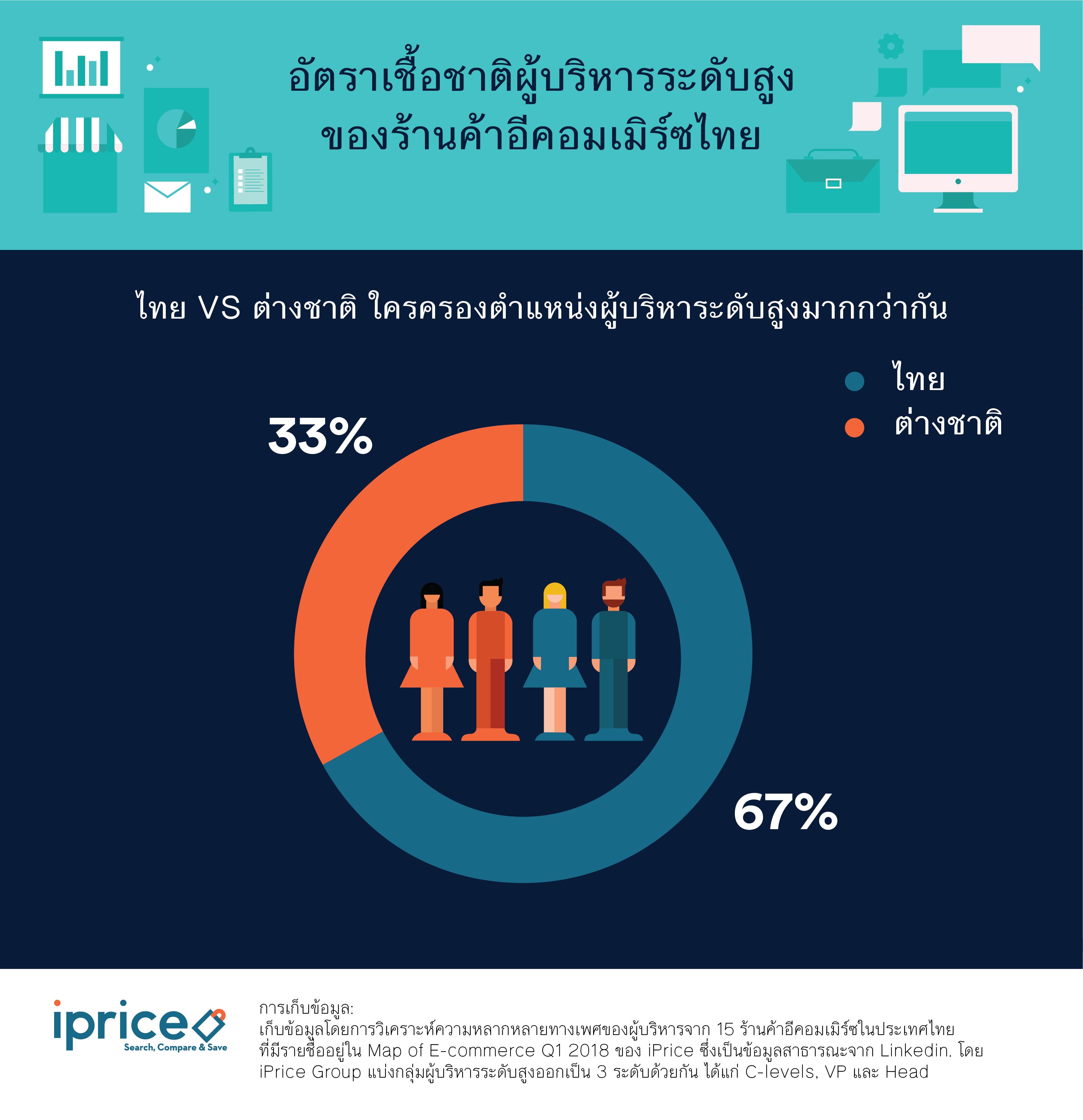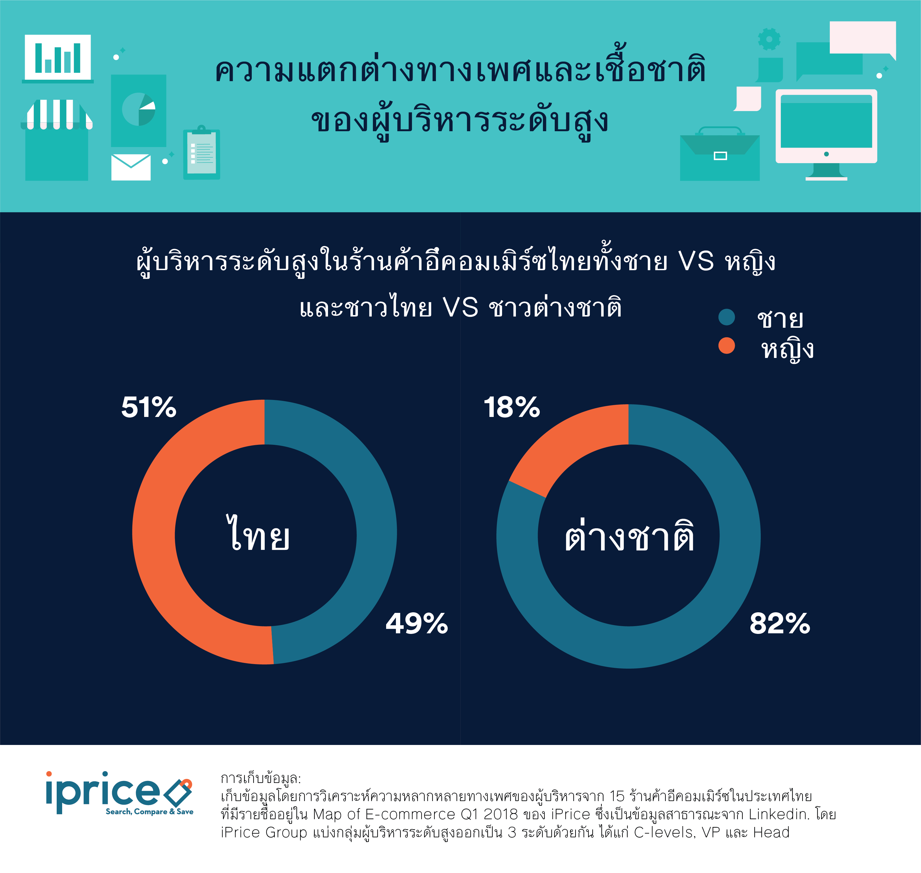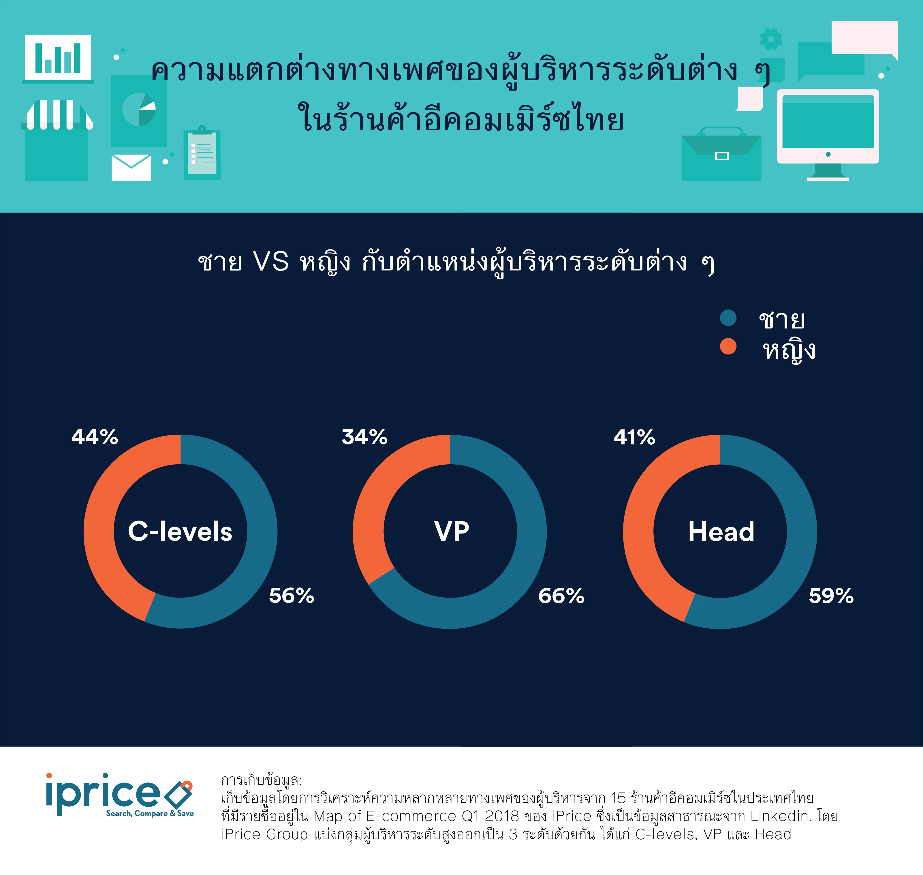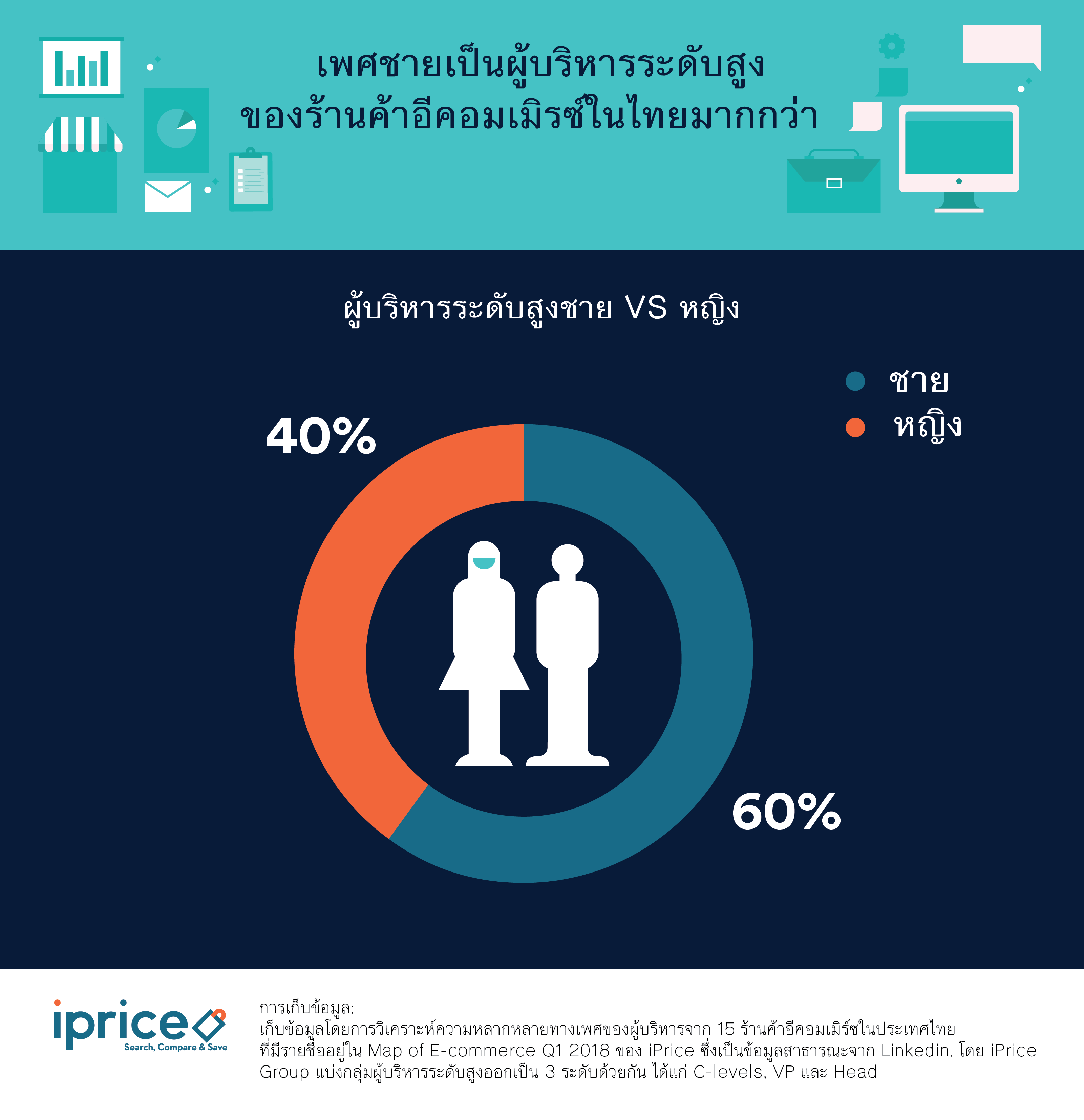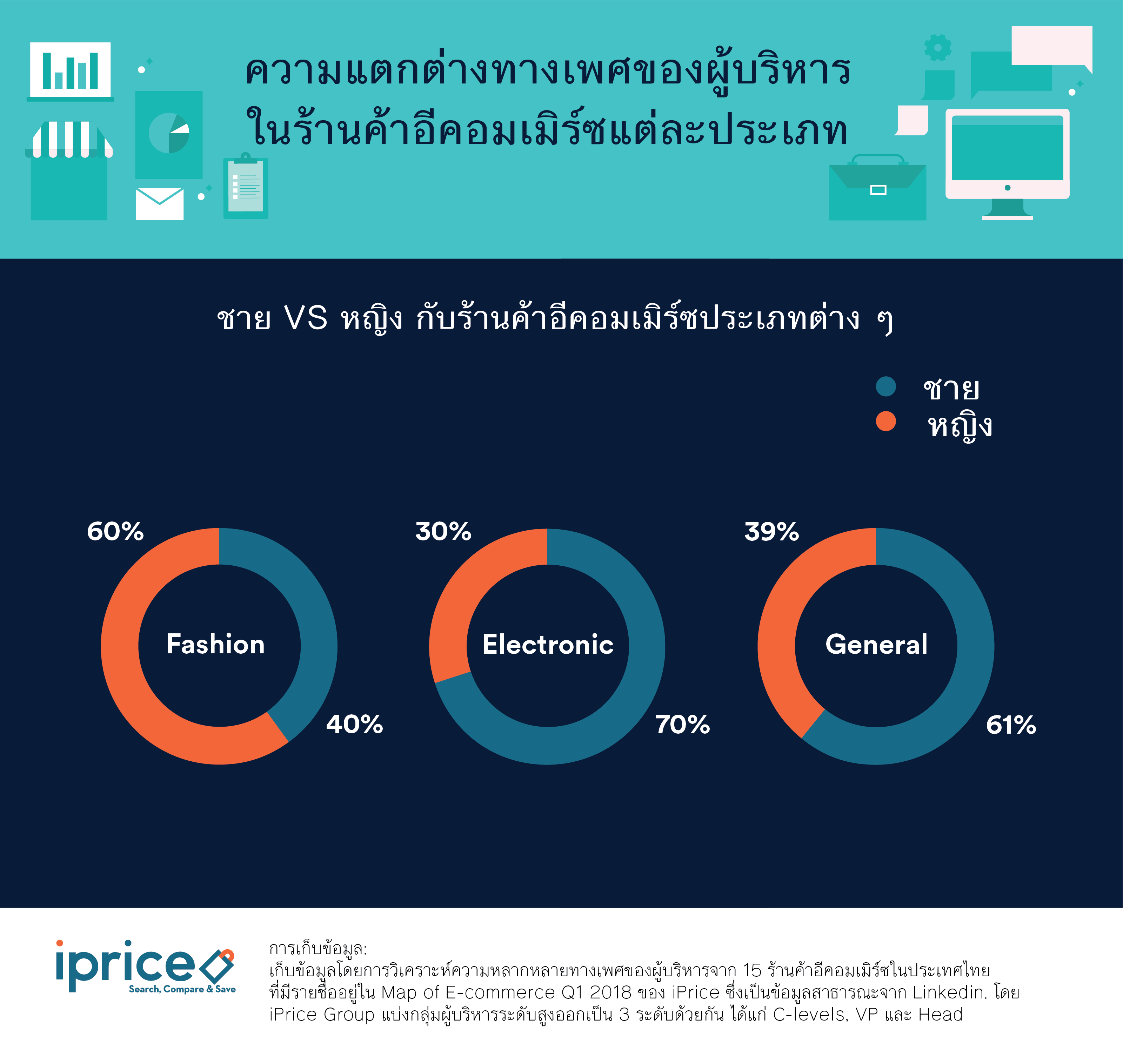 ปฎิเสธไม่ได้ว่าธุรกิจอีคอมเมิร์ซกำลังได้รับความนิยมในประเทศแถบเอเชียตะวันออกเฉียงใต้อย่างมาก แต่จะรุ่งหรือร่วงนอกจากรูปแบบการบริการที่จับกลุ่มลูกค้าได้อยู่หมัดแล้ว การบริหารงานภายในบริษัทก็สำคัญไม่ยิ่งหย่อนไปกว่ากัน ยิ่งบริษัทไหนมีผู้บริหารวิสัยทัศน์กว้างไกล ยิ่งเปิดศึกงัดข้อกับคู่แข่งได้ยาวนานเท่านั้น หากเป็นผู้บริหารระดับสูงในประเทศไทยเมื่อก่อนคงเต็มไปด้วยเพศชาย เพราะวัฒนธรรมดั้งเดิมที่ถูกปลูกฝังว่าเพศชายต้องเป็นช้างเท้าหน้าเสมอทำให้น้อยครั้งนักที่จะมีผู้บริหารเพศหญิงในองค์กร แต่เพราะยุคสมัยเปลี่ยนไป ปัจจุบันเพศหญิงและเพศชายมีความเท่าเทียมกันมากขึ้น ประกอบกับธุรกิจอีคอมเมิร์ซในไทยส่วนใหญ่จะทำการตลาดในต่างประเทศด้วย ทาง iPrice จึงทำการศึกษาข้อมูลโดยการวิเคราะห์ความหลากหลายทางเพศของผู้บริหารในร้านค้าอีคอมเมิร์ซไทย ทำให้พบข้อมูลที่น่าสนใจถึง 5 ประเด็นด้วยกัน ดังนี้