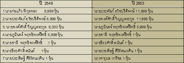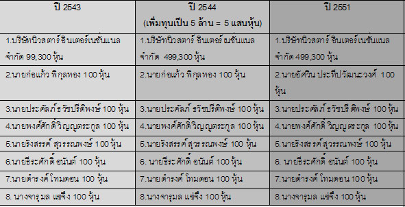 ผู้ถือหุ้น ณ วันที่ 28 มีนาคม 2549 จำนวน 7 ราย ประกอบด้วย นายประคัลภ์ จำนวน 8,999 หุ้น เท่ากับนายก่อแก้ว พิกุลทอง 8,999 หุ้น นายพงศ์ศักดิ์ 6,000 หุ้น นายภูมินทร์ 5,999 หุ้น นายชาลี พฤทธิพงศ์สิทธิ์ 1 หุ้น นายธีระศักดิ์ อนันต์ 1 หุ้น และนายประดิษฐ์ ศิริรัตนเวคิน 1 หุ้น