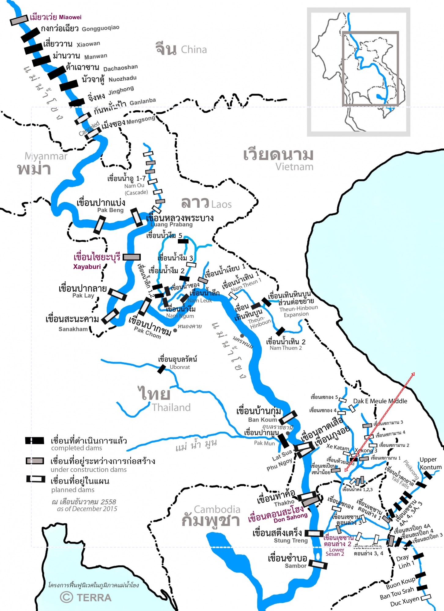 ขณะที่ มูลนิธิฟื้นฟูชีวิตและธรรมชาติ เปิดแผนที่โครงการเขื่อนบนแม่น้ำโขง ข้อมูล ณ เดือนธันวาคม 2558 โดยเฉพาะในสปป.ลาว จะเห็นว่า มีทั้งเขื่อนที่ดำเนินการแล้ว อยู่ระหว่างการก่อสร้าง และเขื่อนที่อยู่ในแผน