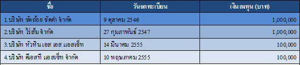 ทั้งนี้ เมื่อวันที่ 14 มีนาคม 2555 ที่ผ่านมา นางสาวสุกัญญา แซ่ลิ่ม และนางสาวอังคณา วัฒนมงคลศิลป์ กรรมการบริษัท ไร่ส้ม จำกัด และบริษัท ชัดถ้อยชัดคำ จำกัด ได้จดทะเบียนก่อตั้งบริษัทใหม่ชื่อ บริษัท หัวหิน เอส เอส แอสเซ็ท จำกัด ทุนจดทะเบียนเริ่มแรก 100,000 บาท ประกอบธุรกิจ ให้เช่า การขาย การซื้อขายและดำเนินงานด้านอสังหาริมทรัพย์ ที่ตั้งเลขที่ 111/120 หมู่ที่ 3 แขวงคลองถนน เขตสายไหม กรุงเทพฯ นางสาวสุกัญญา ถือหุ้น 998 หุ้น มูลค่า 99,800 บาท หรือ 99.8% นางสาวสิริทรัพย์ พึ่งตัว และนางสาว อังคณา วัฒนมงคลศิลป์ ถือคนละ 1 หุ้น มูลค่าหุ้นละ 100 บาท รวมหุ้นทั้งหมด 100,000 หุ้น มีนางสาวสุกัญญา นางสาวสิริทรัพย์ และ นางสาวอังคณา เป็นกรรมการ