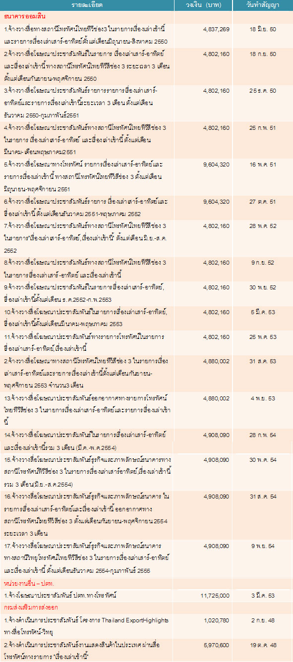 เจาะ“สรยุทธ สุทัศนะจินดา”ฟันรายได้ไม่หยุด แบงก์ออมสินอัดฉีดโฆษณาผ่านเรื่องเล่าฯช่อง 3 เกือบ 5 ล้าน เบ็ดเสร็จทำสัญญาผูกปิ่นโต 17 ครั้ง 93.8 ล้าน –ส่งเด็กตั้ง บ.ใหม่ 2 แห่งรวด“เสี่ยตัน โออิชิ”หุ้นส่วน