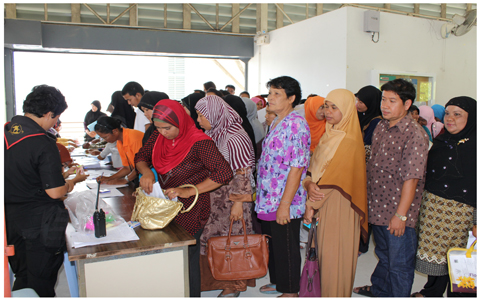 1 ผู้ได้รับผลกระทบและญาติกำลังเข้าแถวลงทะเบียนขอรับการช่วยเหลือเยียวยา ในการออกหน่วยเคลื่อนที่วันแรกของ ศอ.บต.ที่อาคารศรีนิบง อ.เมืองยะลา