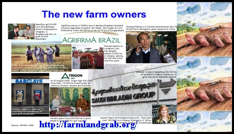 ข้อมูลจาก GRAIN องค์กรพัฒนาเอกชน ที่ทำงานสนับสนุนเกษตรกรรายย่อย ส่งเสริมเรื่องความหลากหลายทางชีวภาพ มีสำนักงานตั้งอยู่ที่เมืองบาเซโลนา ประเทศสเปน อีกหนึ่งองค์กรที่ได้เปิดปมการแย่งยึดที่ดินของบรรษัทข้ามชาติในประเทศกำลัง พัฒนาต่างๆ ไว้ในงานสมัชชาวิชาการความมั่นคงทางอาหารประจำปี 2554 ซึ่งจัดโดยแผนงานสนับสนุนความมั่นคงทางอาหาร มูลนิธิชีววิถี (Biothai) และเครือข่าย ณ อาคารวชิรานุสรณ์ มหาวิทยาลัยเกษตรศาสตร์ ว่า