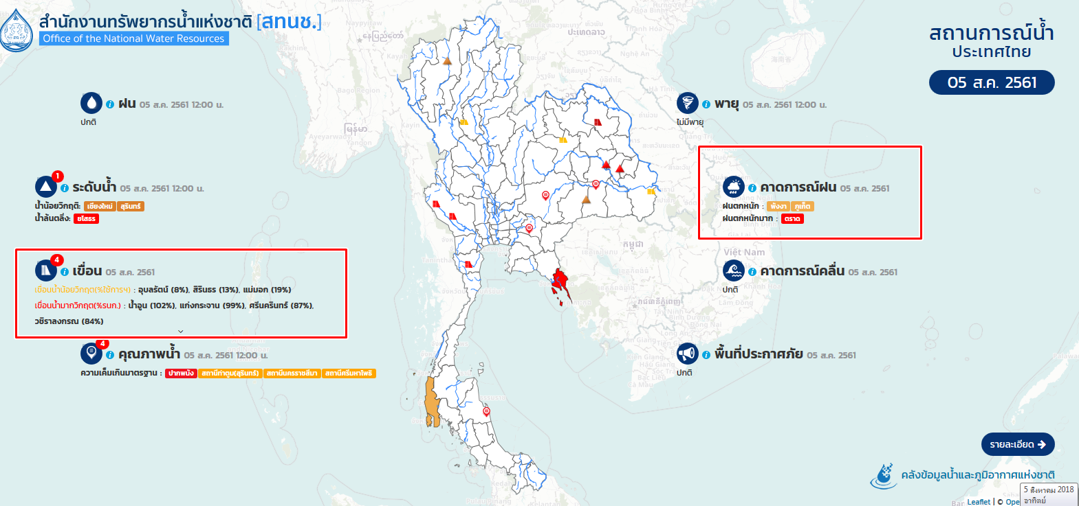 ขณะที่สำนักงานทรัพยากรน้ำแห่งชาติ (สทนช.) รายงานสถานการณ์น้ำ ณ วันที่ 5 สิงหาคม เวลา 12:00 น. เขื่อนแก่งกระจานมีน้ำมากระดับวิกฤติ 99% เขื่อนน้ำอูน 102% เขื่อนศรีนครินทร์ 87% และเขื่อนวชิราลงกร์ 84%