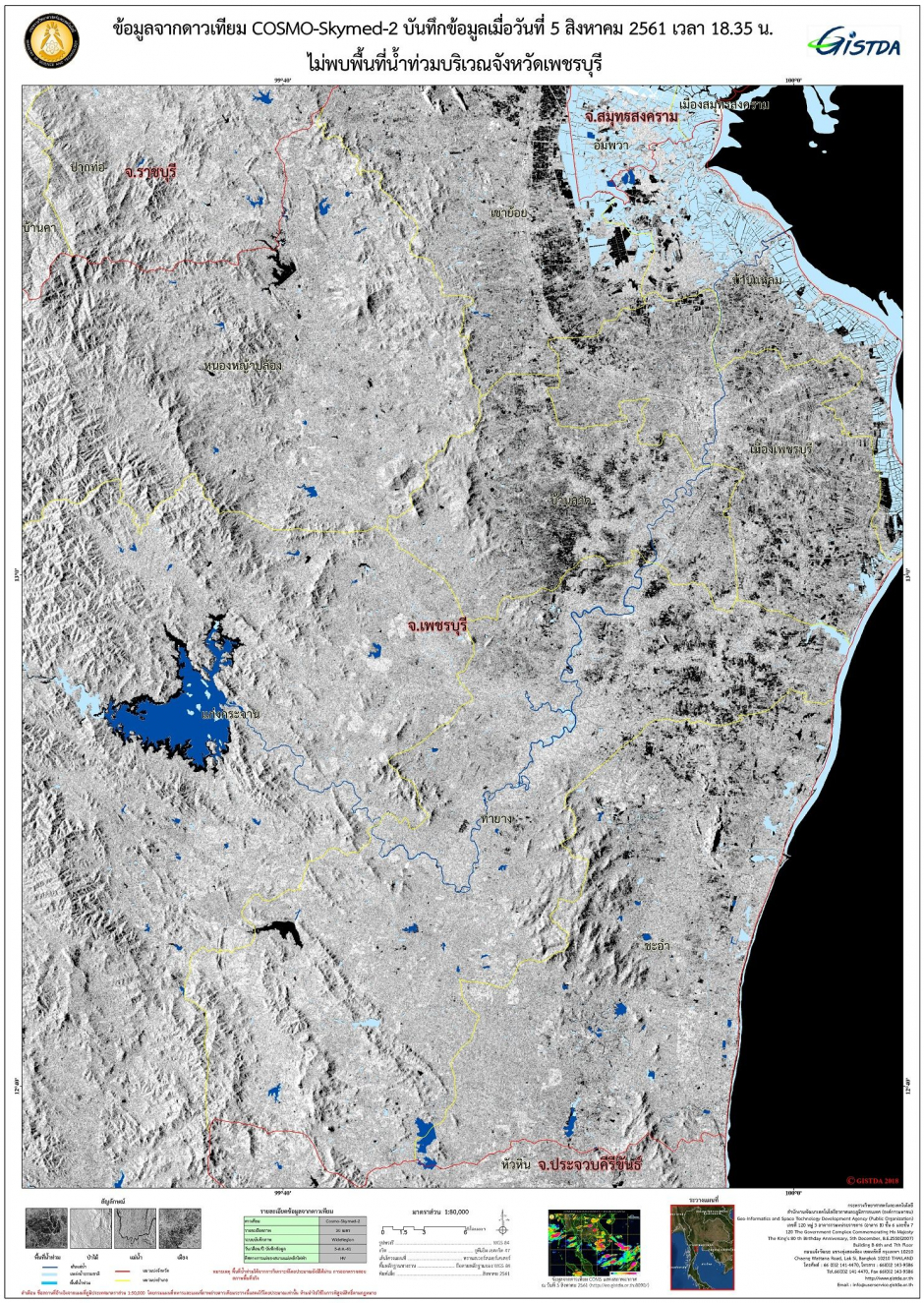 ด้านสำนักงานพัฒนาเทคโนโลยีอวกาศและภูมิสารสนเทศ (องค์การมหาชน) หรือจิสด้า ใช้ดาวเทียม Cosmo-Skymed-2 ติดตามสถานการณ์น้ำท่วมเพชรบุรี ข้อมูล ณ วันที่ 5 สิงหาคม เวลา 18.35 น. โดยยังไม่พบพื้นที่น้ำท่วมขัง บริเวณจังหวัดเพชรบุรี