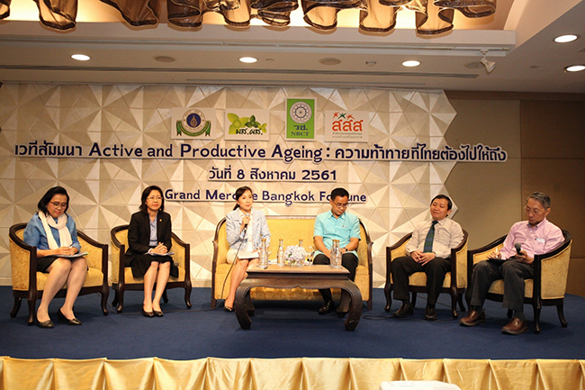 เมื่อวันที่ 8 ส.ค. 2561 ที่โรงแรมแกรนด์เมอเคียว มูลนิธิสถาบันวิจัยและพัฒนาผู้สูงอายุไทย (มส.ผส.) ร่วมกับ สำนักงานคณะกรรมการวิจัยแห่งชาติ (วช.) สำนักงานกองทุนสนับสนุนการสร้างเสริมสุขภาพ (สสส.) และคณะแพทยศาสตร์โรงพยาบาลรามาธิบดี มหาวิทยาลัยมหิดล จัดเวทีสัมมนา “Active and Productive Ageing : ความท้าทายที่ไทยต้องไปให้ถึง”เพื่อสร้างการรับรู้และสร้างการมีส่วนร่วมของทุกภาคส่วนต่างๆ ที่เกี่ยวข้อง ทั้งผู้กำหนดนโยบาย ผู้บริหาร นักวิชาการ และภาคีเครือข่ายภาคประชาชนในการนำผลงานวิจัยที่ได้ไปใช้ประโยชน์อย่างต่อเนื่อง