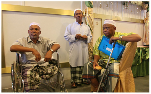1 ผู้สูงอายุที่บางรายตกเป็นเหยื่อความรุนแรงจนพิการ ต้องนั่งรถเข็นมายื่นเอกสารลงทะเบียน (ภาพโดย อับดุลเลาะ หวังหนิ)